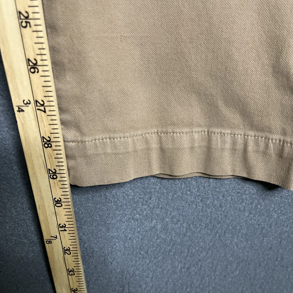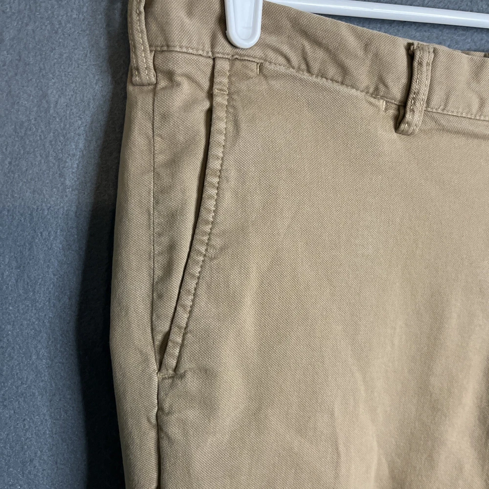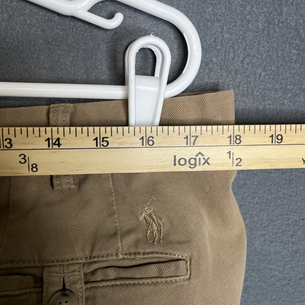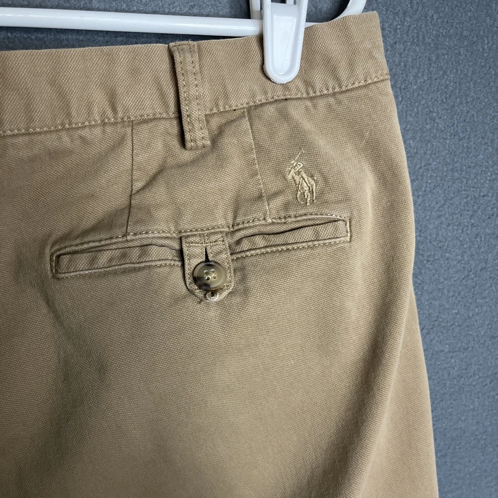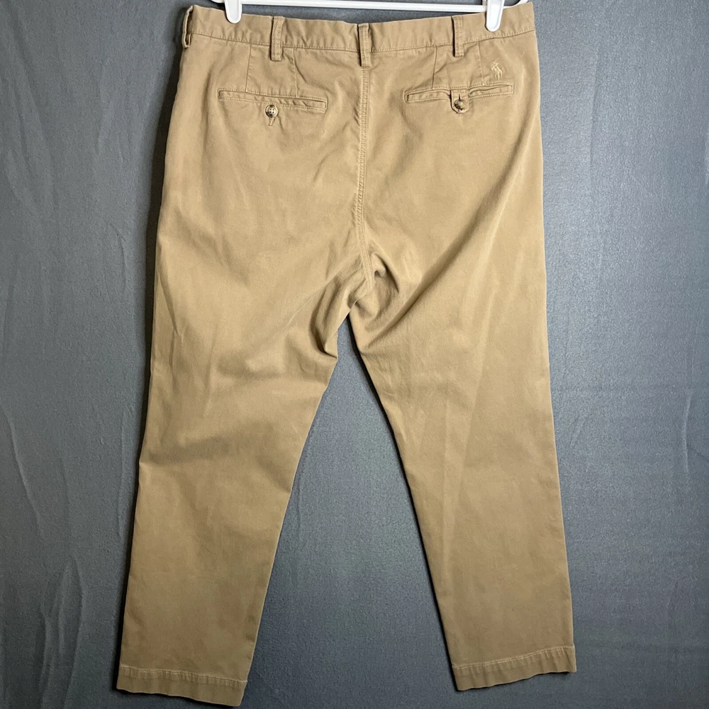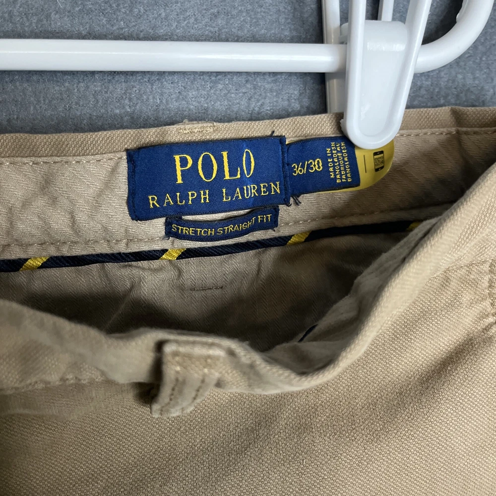 This is a pair of Polo Ralph Lauren chino pants for men in size 36x30. The pants are in a tan khaki color and feature a solid pattern with a stretch straight fit. They have a zip and button closure, flat front design, and slash pockets. Made of a cotton blend fabric with embroidered logo accents, these pants are suitable for various occasions such as travel, weddings, parties, casual or formal events.
