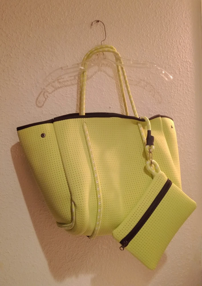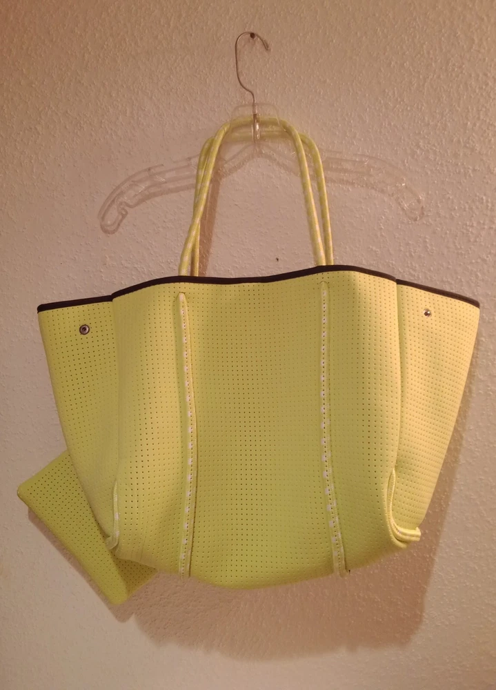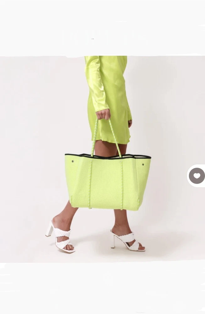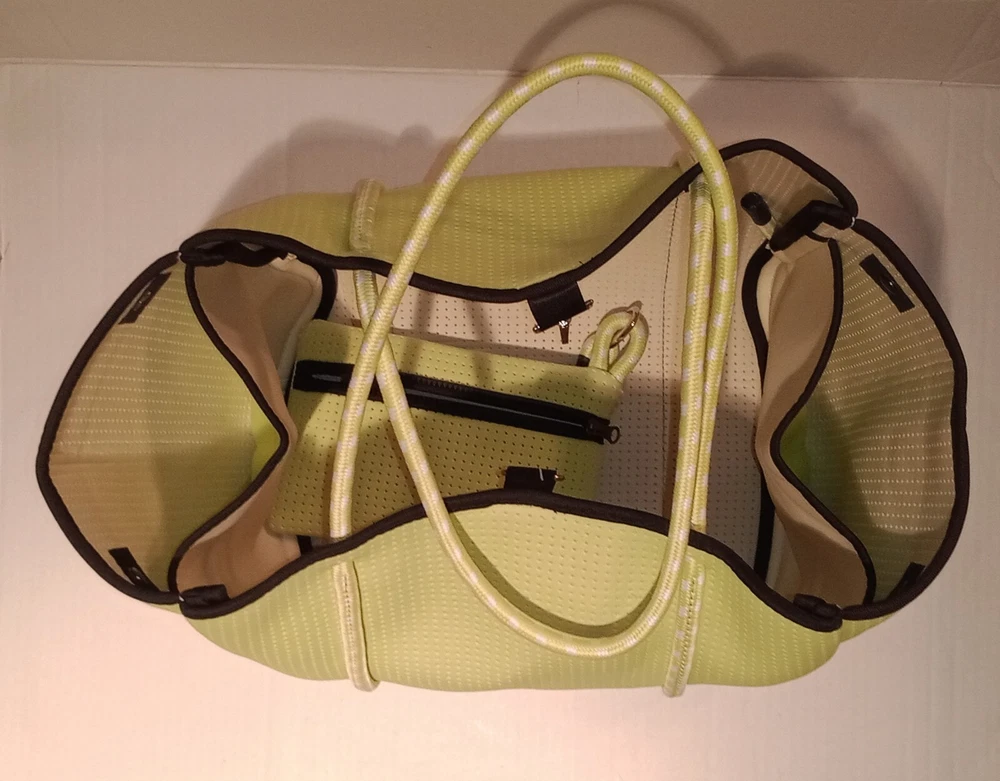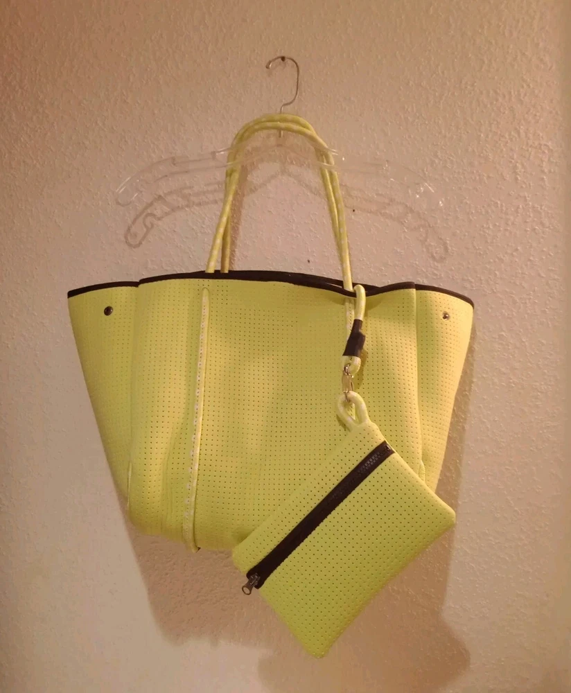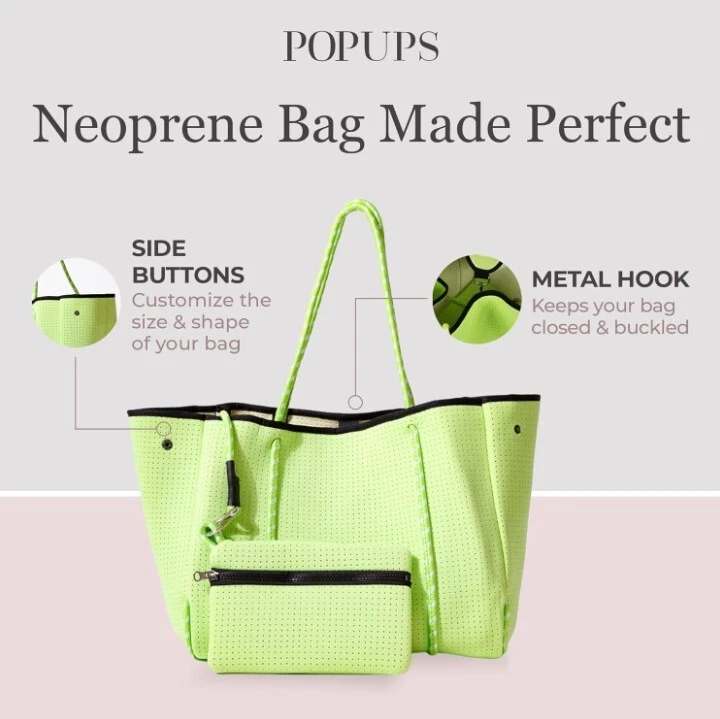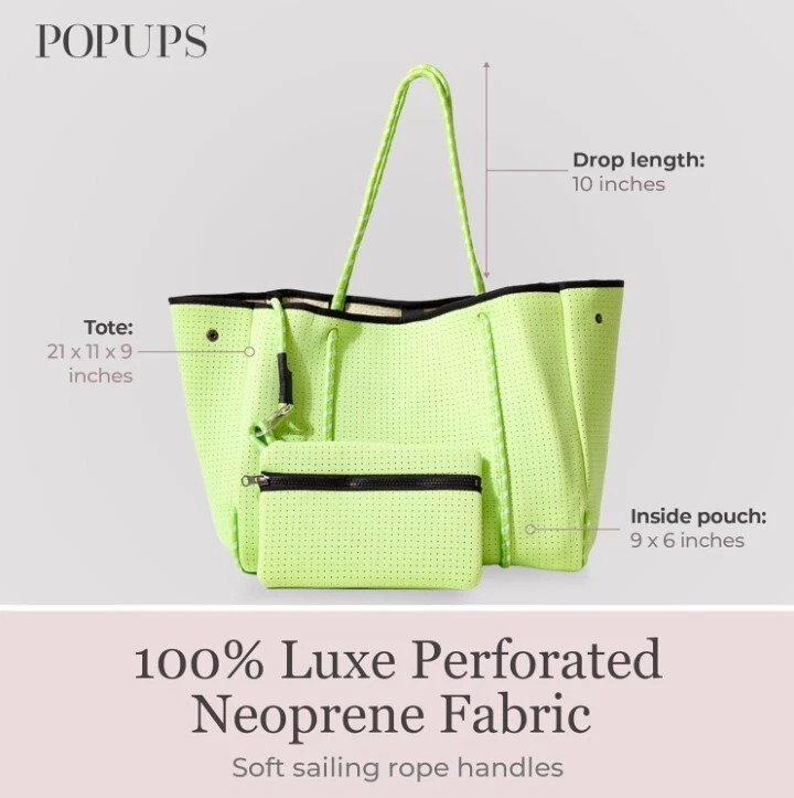 POPUPS Everday Tote Bag With Essentials Pouch, Neon Green Neoprene, $114 NWOT. Beautiful, vibrant color. It can look different under different lighting. Popular, utilitarian. Versatile use. Stands up. Well made with quality materials. Washable in cold water. Large, roomy, with inner pockets. Excellent condition, new without the tags and packaging, never worn, with no major flaws, damage, etc noted. Zoom in. See pics and illustrations with approximate measurements... Please see my other quality items including designer handbags, designer shoes, designer, vintage, semi-precious jewelry, Swiss watches, apparel, and home goods, etc. Thanks for looking.