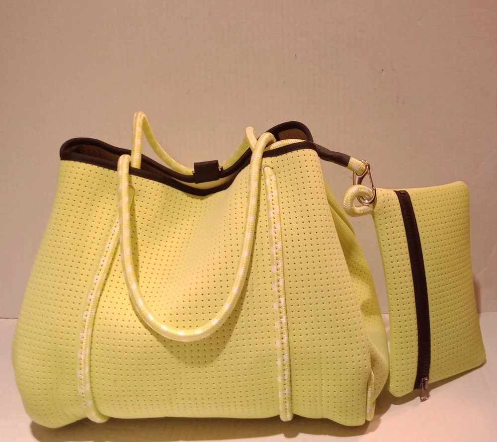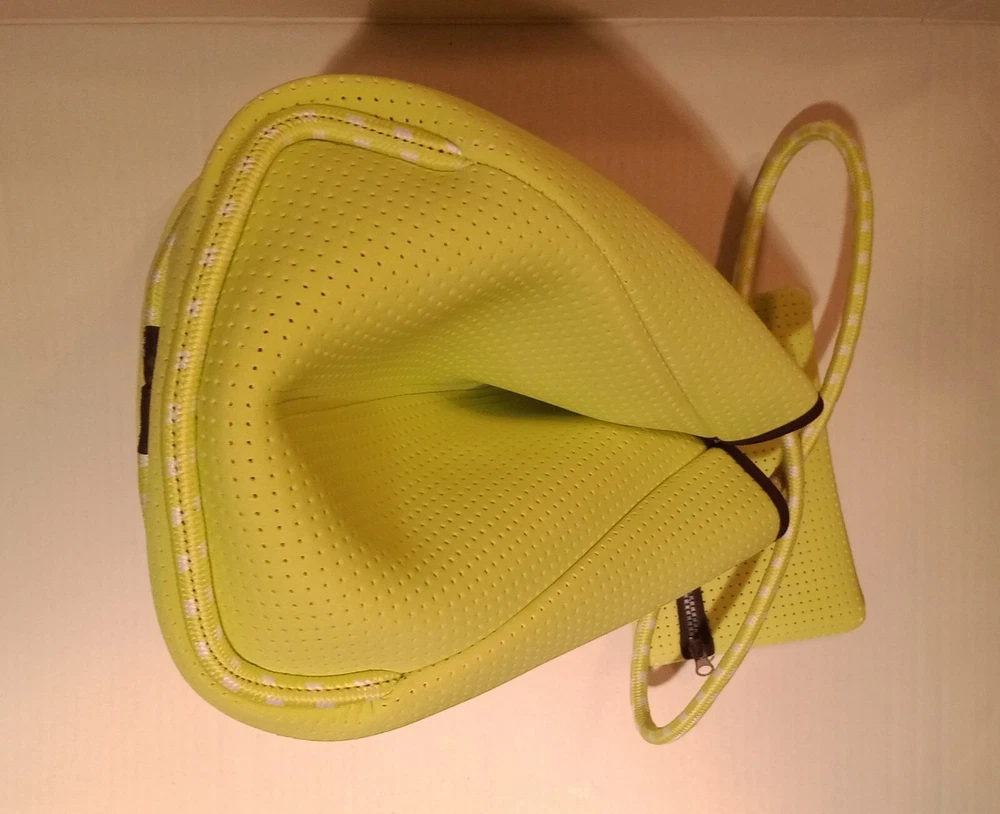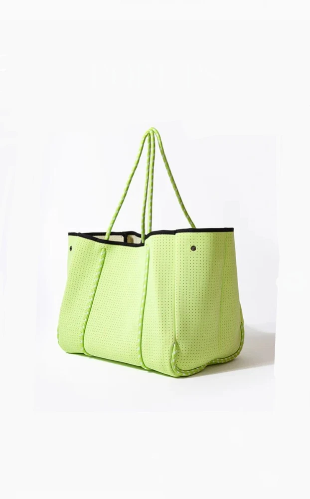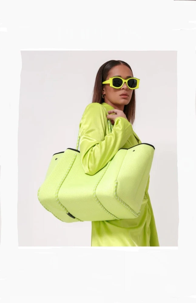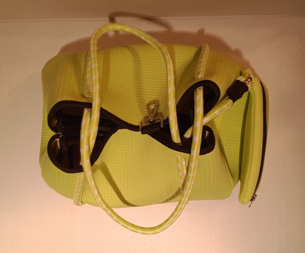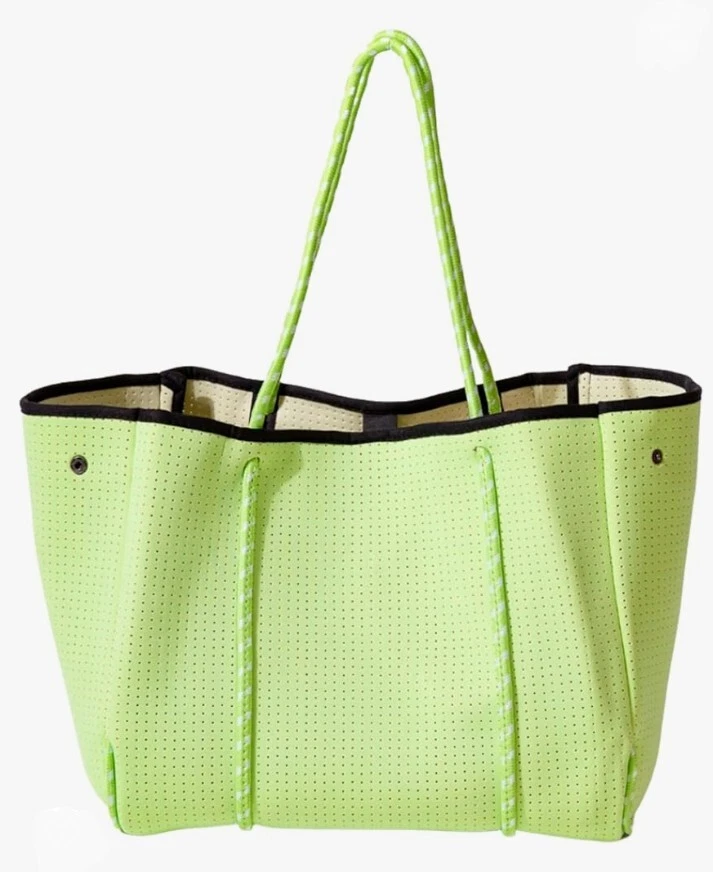 POPUPS Everday Tote Bag With Essentials Pouch, Neon Green Neoprene, $114 NWOT. Beautiful, vibrant color. It can look different under different lighting. Popular, utilitarian. Versatile use. Stands up. Well made with quality materials. Washable in cold water. Large, roomy, with inner pockets. Excellent condition, new without the tags and packaging, never worn, with no major flaws, damage, etc noted. Zoom in. See pics and illustrations with approximate measurements... Please see my other quality items including designer handbags, designer shoes, designer, vintage, semi-precious jewelry, Swiss watches, apparel, and home goods, etc. Thanks for looking.