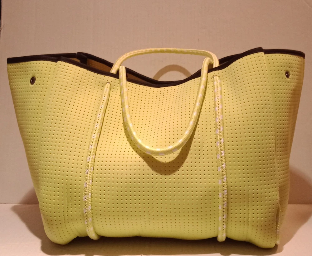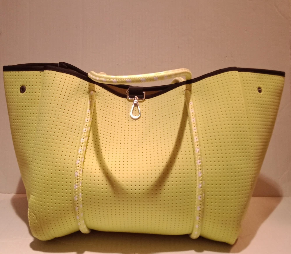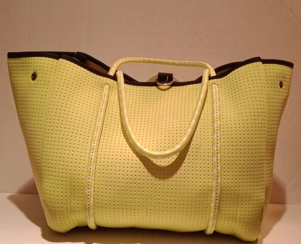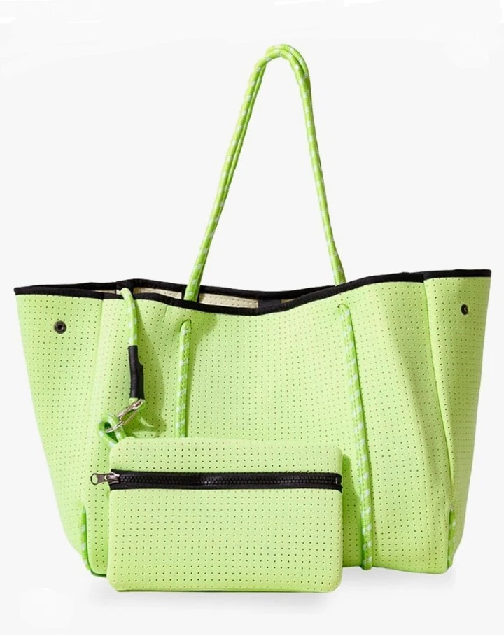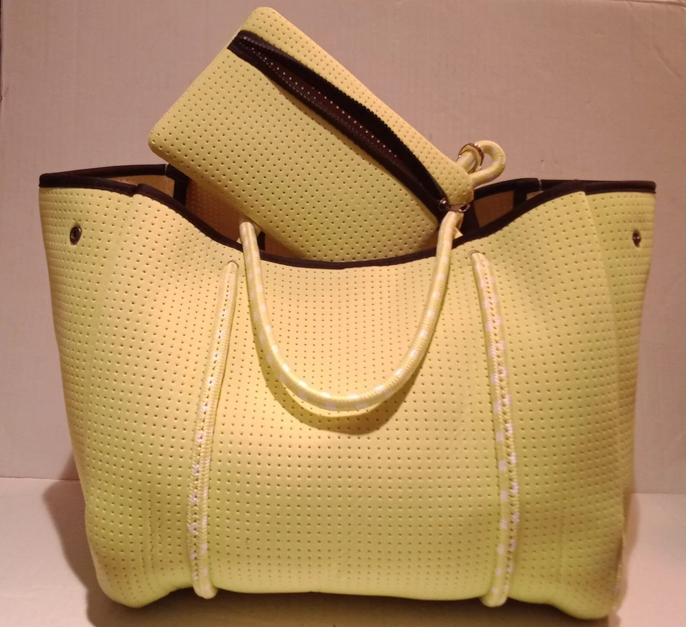 POPUPS Everday Tote Bag With Essentials Pouch, Neon Green Neoprene, $114 NWOT. Beautiful, vibrant color. It can look different under different lighting. Popular, utilitarian. Versatile use. Stands up. Well made with quality materials. Washable in cold water. Large, roomy, with inner pockets. Excellent condition, new without the tags and packaging, never worn, with no major flaws, damage, etc noted. Zoom in. See pics and illustrations with approximate measurements... Please see my other quality items including designer handbags, designer shoes, designer, vintage, semi-precious jewelry, Swiss watches, apparel, and home goods, etc. Thanks for looking.