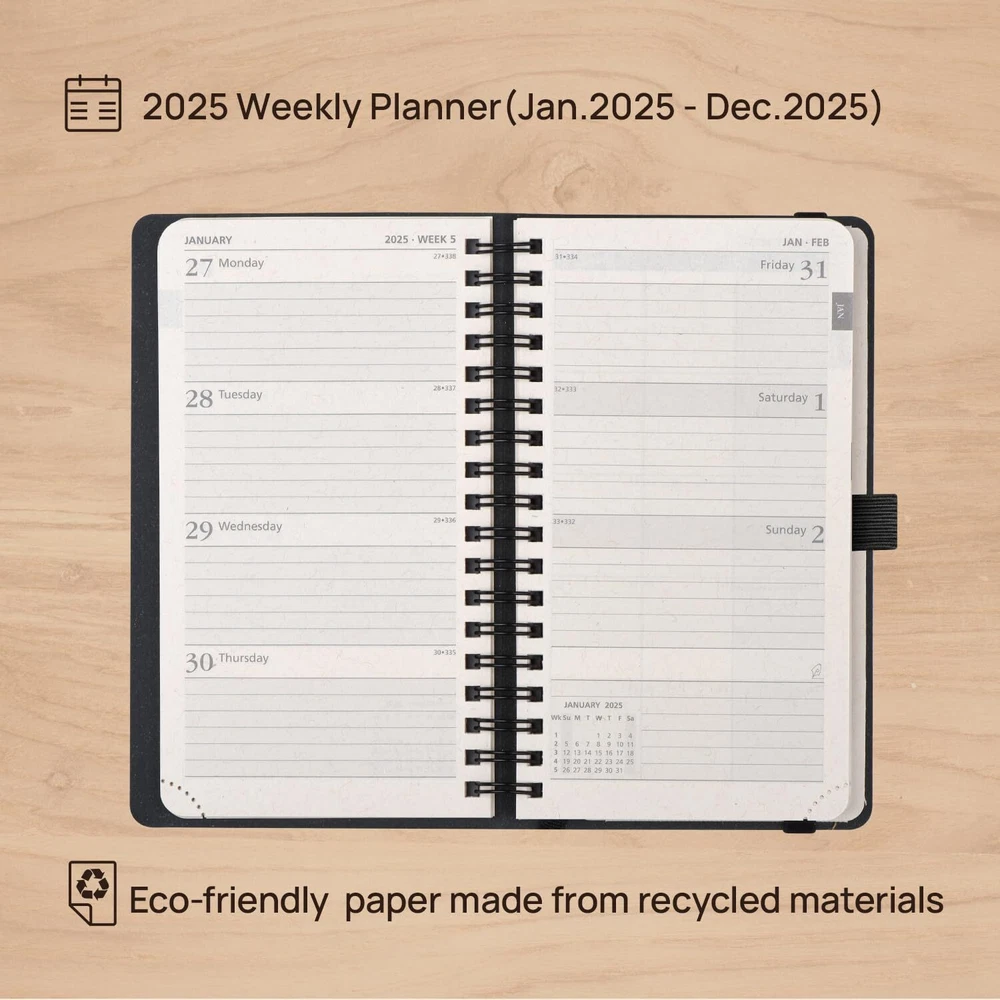 POPRUN 2025 Pocket Calendar - 2025 Recycled Weekly Planner [Italian Regenrated Leather - Pocket Size 3.5'' x 6.5''] - 2025 Pocket Spiral Planner Weekly and Monthly for Purse - Black Grey RECYCLED PLANNER – Features both FSC and GRS certified 100% post-consumer waste recycled paper and package with biodegradable ribbon markers, which is committed to contributing to the renewable protection of the earth. JAN.2025 - DEC.2025 PLANNER - The size is (3.5'' X 6.5''),small planner for purse,comfortable to carry and use,which makes your busy daily routines organized. 2 PAGES PER WEEK - Lay flat week-to-view on 2 pages, this weekly planner presents spacious everyday planning with for your appointments, which makes your busy daily routines organized. QUICK SEARCH FUNCTION - The Tear-Off Corners allow you to quickly browse and locate the current date. Besides; the Bookmark Ribbons are added to mark any wanted page of your choice. EXTRA FUNCTION PAGES - This 2025 weekly planner also contains "2025-2026 Yearly Overview" Page + "2025-2026 Holiday & Calendar" Page + Monthly Expenses Page+ Contact & Password Pages + 7 Dotted Notes Pages for jotting down your ideas, thoughts or any other happy things in detail. RECYCLED PLANNER – Features both FSC and GRS certified 100% post-consumer waste recycled paper and package with biodegradable ribbon markers, which is committed to contributing to the renewable protection of the earth. JAN.2025 - DEC.2025 PLANNER - The size is (3.5'' X 6.5''),small planner for purse,comfortable to carry and use,which makes your busy daily routines organized. 2 PAGES PER WEEK - Lay flat week-to-view on 2 pages, this weekly planner presents spacious everyday planning with for your appointments, which makes your busy daily routines organized. QUICK SEARCH FUNCTION - The Tear-Off Corners allow you to quickly browse and locate the current date. Besides; the Bookmark Ribbons are added to mark any wanted page of your choice. EXTRA FUNCTION PAGES - This 2025 weekly planner also contains "2025-2026 Yearly Overview" Page + "2025-2026 Holiday & Calendar" Page + Monthly Expenses Page+ Contact & Password Pages + 7 Dotted Notes Pages for jotting down your ideas, thoughts or any other happy things in detail. Shipping from the USA All of our products are shipped from the USA, ensuring quick delivery to your destination. Payment We offer the following payment methods: PayPal, credit card, bank transfer, and eBay's secure payment system. Free Shipping & Free Returns Shipping within the USA is FREE. Additionally, any return is absolutely free for you. Risk-Free Purchase You have the option to return an item within 30 days without any justification. We cover the return shipping costs! Fast Shipping We ship immediately upon receipt of payment. Generally, the package is delivered within 2-3 days in the USA. If it takes longer, we will contact you. Quality and Costs Made in Europe, USA, China No customs fees or additional charges Total satisfaction guarantee Invoice with declared VAT available upon request in .pdf format Feedback Your feedback is very important to us. After you pay for your purchase, you will automatically receive positive feedback from us.