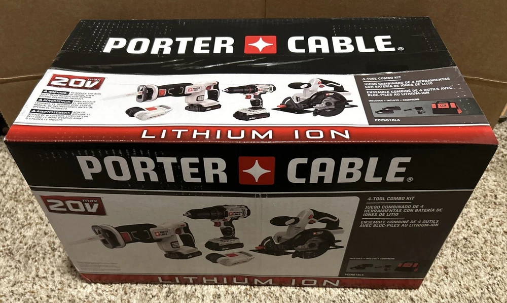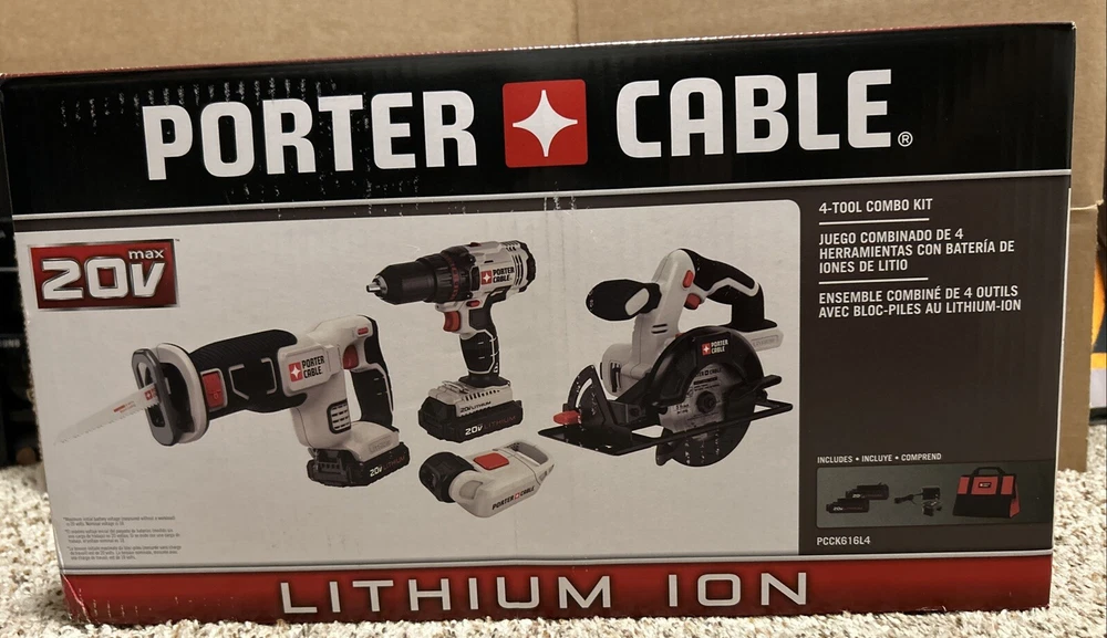 The PORTER-CABLE 20V MAX Combo Kit includes 4 power tools - a drill/driver, circular saw, reciprocating saw, and LED flashlight. It comes with 2 lithium-ion batteries and a charger for continuous use. The tools operate on a 20V voltage and are powered by brushed motors for efficient performance. This versatile kit by PORTER-CABLE is ideal for various home and workshop projects, offering convenience and reliability with its cordless design and included batteries.