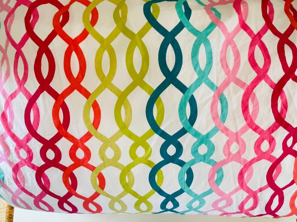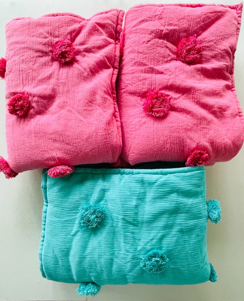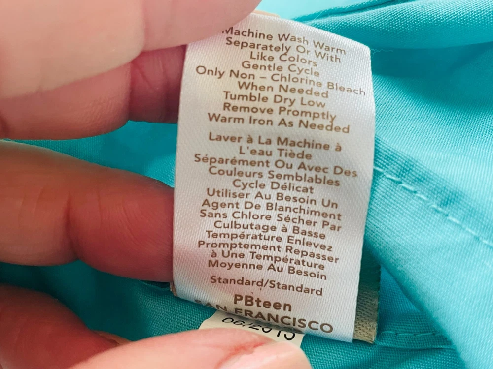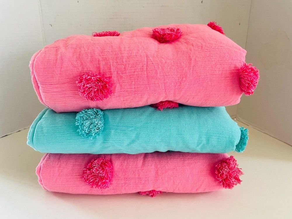 POTTERY BARN PB TEEN Palm Beach Multicolor Twin Duvet & Comforter & Shams Set Geometric Colorful Twin Duvet 100% Cotton Button Closure Twin Comforter for Duvet is included 2 Pom Pom Pink Shams 1 Pom Pom Green Sham Tie Closure 62% Cotton 38% Polyester Standard Size- 20 x 26 inches Very Good Condition