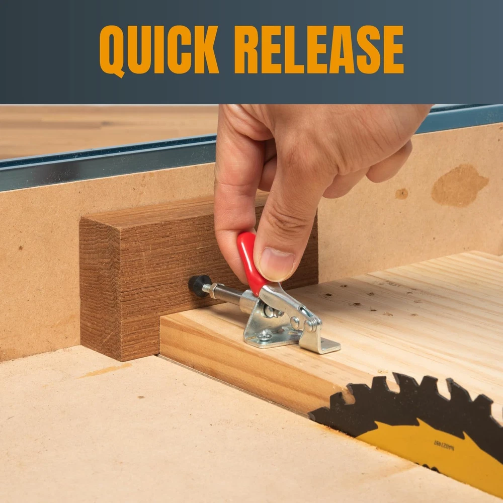 INCLUDES: (6) Push pull quick release toggle clamp (Type-301A) FUNCTION: Push/pull action can quick and easy adjustability means customizing clamp to stock thickness and placement is hassle free. Large, plastic handle maximizes user comfort, safety and control PREMIUM DESIGN: Constructed of zinc-plated, cold-rolled carbon steel for optimal durability and wear-resistance, and the unique design features a high-utility cam/lever system to insure the ultimate in fastening security and stability. HOLDING CAPACITY: 100 lbs SPECS: Clamping Base Dimension: 1-5/16" to 1-1/16"; Mounting slot measures: 5/32" DIA; Clamping range extends from 1-3/16" to 2-1/4"; Bolt length (including rubber feet): 1"; Clamp height capacity when fastened: 1-7/8"; Total Clamp length (including handle) during use: 3" to 3-9/16" The POWERTEC 20323 Push/Pull Quick-Release Toggle Clamps , 100 lbs Capacity, 301A , 4PK , deliver a rock-solid grip on your stock when your project requires a push/pull holding-action that locks your workpiece, flush and tight, against a positive stop. Their unique design features a high-utility cam/lever system to insure the ultimate in fastening security and stability. FEATURES Their quick and easy adjustability means customizing clamp to stock thickness and placement is hassle free. To utilize, just easily install base onto your jig/fixture, adjust the reach to suit your projects specific requirements, and pull handle back to insure optimal pushing force on your stock - it's that easy. The rubber clamping foot won't mar your stock surface, and the large, plastic handle supplies a comfortable and ergonomic grip. SPECS Clamping Base Dimension: 1-5/16" to 1-1/16" Mounting slot measures: 5/32" DIA Clamping range extends from 1-3/16" to 2-1/4" Bolt length (including rubber feet): 1" Clamp height capacity when fastened: 1-7/8" Total Clamp length (including handle) during use: 3" to 3-9/16"
