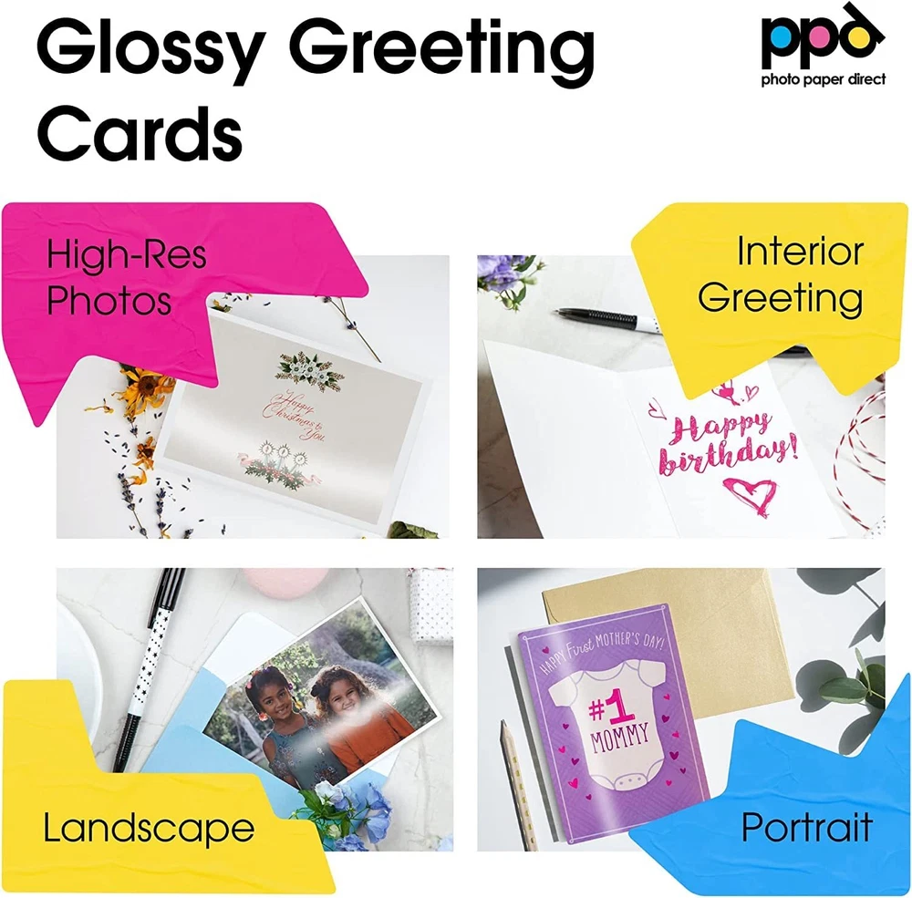 Use this printable greeting card paper / card stock to print your own professional looking greetings cards, christmas cards, thank you notes, invitations, announcements for any occasion, with your own personal creative touches, right from the comfort of your own home. Characteristics: Size - 8.5X11" Weight - 64LBS Finish - Glossy Pack Size - 20 Cards Features: Instant dry - Handle right after printing - no smears! Blank - No watermark or logo on either side. Printable on both sides - Best color gamut and sub tone reproduction (photographic paper quality) on the outside coated side and simple graphics and text in normal quality on the uncoated internal side. Machine Pre-Scored - Easily fold the card in the middle after printing. Compatibility: Printer and Ink - Suitable with all Inkjet printers using every day normal inks. Step-by-step printer settings set-up included in the pack. High-Quality Performance: Our printable greeting cards are crafted from heavyweight 10.9 mil (64 lb/240 gsm) cardstock, offering exceptional durability and a premium feel. Each set includes 20 sheets, providing ample material for all of your projects. The cards feature a glossy finish on the outside for enhanced photographic quality while the matte finish on the inside ensures clean, readable text. Measuring 8.5 x 11 inches, they can be easily folded to 5.5 x 8.5 inches along the prescored line. Versatile for Any Occasion: These blank white greeting cards are perfect for a wide range of events, including birthdays, wedding invitations, and thank you notes. The customizable nature of these cards allows you to add your own photographs and text, making them ideal for creating personalized invitations, heartfelt greeting cards, or stylish thank-you notes. Our versatile card paper accommodates all your creative needs, offering flexibility for any occasion. Easy to Use: Each set comes designed specifically for 5.5 x 8.5 inch note cards. The prescored design of the cards simplifies the folding and assembly process, making it an ideal DIY card project. Whether you're a beginner or an experienced crafter, you'll find this set perfect for creating personalized cards with ease, ensuring a smooth and efficient greeting card making experience. Custom Prints with High-Quality Imagery: The glossy finish on the exterior of these blank white printable cards offers a stunning high color gamut and photographic quality, making your images and designs stand out with vibrant, eye-catching detail. Meanwhile, the matte interior is ideal for clean, readable text and personal messages and greetings offering extreme functionality. Whether you're printing photographs or detailed graphics, these note cards deliver exceptional results. Compatible with All Inkjet Printers: Our greeting card paper is compatible with any inkjet printer, whether you use dye-based or pigment-based inks. The unique design allows you to print on both the glossy exterior and the matte interior, ensuring you can customize both sides. Enjoy consistent, high-quality prints that bring your custom designs and photographs to life. With hassle-free printing, you can achieve reliable, professional results every time, making your greeting cards stand out. Trusted Quality by Photo Paper Direct: Photo Paper Direct has been a leading quality supplier since 1992, known for its commitment to excellence. All products are proudly made in the United Kingdom, ensuring highest standards of quality and craftsmanship. With decades of experience, Photo Paper Direct continues to deliver exceptional products that meet the demands of both professionals and hobbyists alike.