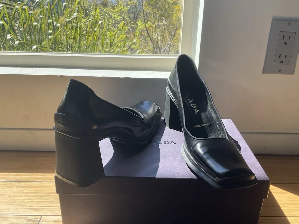 Pattern: Solid Heel Height: High (3-3.9 in) US Shoe Size: 7 Style: Pump Customized: No Occasion: Business, Casual, Formal, Party/Cocktail, Travel, Wedding, Workwear Vintage: No Department: Women Outsole Material: Leather Toe Shape: Square Toe EU Shoe Size: 38.5 Heel Style: Block Lining Material: Leather Country/Region of Manufacture: Italy Upper Material: Leather Color: Black Insole Material: Leather Shoe Width: Standard Type: Heel Brand: PRADA Season: Fall, Spring, Summer, Winter Personalize: No
