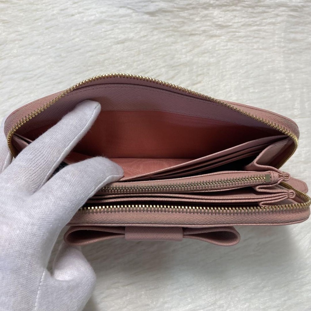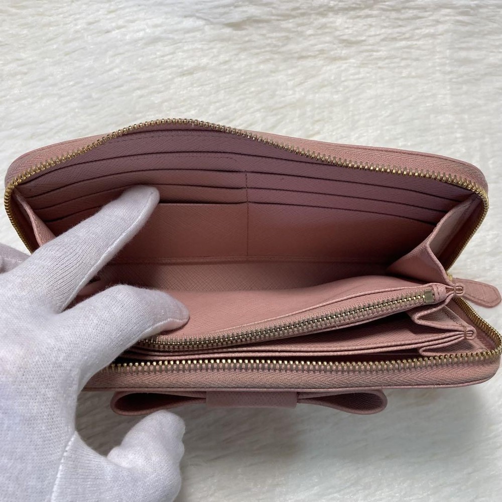 Absolutely love this Prada wallet! The soft pink-beige color is elegant, and the ribbon detail adds a chic touch. The round zipper design is unique and practical, with plenty of space for cards and cash. High-quality leather feels luxurious, and the craftsmanship is flawless. Shipping from Japan was smooth, and no extra duties were charged. A perfect blend of style and function—worth every penny!