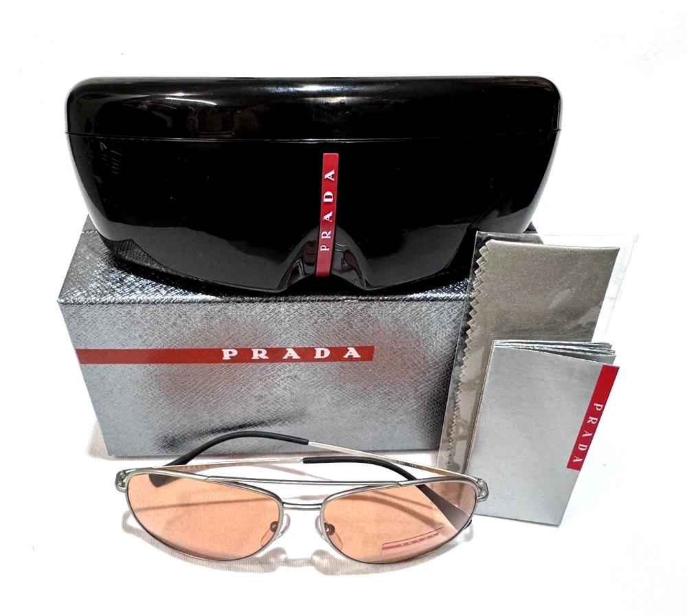 The PRADA SPORT Matte Silver Aviator Sunglasses PS55US - QFP291 are authentic, new eyewear designed for both men and women. These stylish sunglasses feature anti-reflective polycarbonate lenses in rose brown, housed in a matte silver metal frame. With a classic aviator style, these designer sunglasses are perfect for a variety of themes including rock, hippie, retro, and hipster. Made in Italy, these sunglasses have a temple length of 145mm, offering both fashion and functionality for outdoor activities. Size 61-15-145 mm