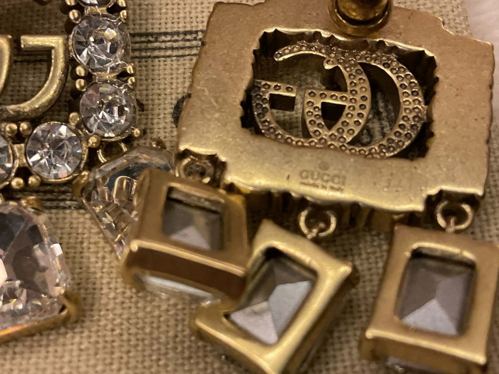 Gucci Crystal Dangle Earrings – Clear Crystals in Iconic Old Gold Tone, Mint Condition Elevate any look with these authentic Gucci Crystal Dangle Earrings, shimmering with clear crystals set in Gucci’s iconic Old Gold tone. Their brilliance makes them effortlessly wearable with any other color, adding sparkle without overpowering your outfit. These earrings embody versatility, moving seamlessly from casual chic to evening glamour. ✨ Highlights: • Clear crystal dangles – radiant sparkle that complements any color wardrobe • Gucci Old Gold tone – warm, vintage-inspired finish unique to Gucci’s legacy • Mint condition – lovingly preserved, no tarnish, no wear • Authenticity assured – dutifully marked and stamped with Gucci’s hallmark • Original Gucci care pouch included – perfect for safekeeping and gifting • Versatile styling – pairs effortlessly with jeans and a crisp white shirt, slacks, or an evening gown • Ageless appeal – sophisticated for any age, timeless for every occasion • Size reference – comparable to the US quarter coin, for easy visualization 🎁 Ready for gifting this season: Whether as a perfect gift for yourself or for someone you care about, these earrings are a versatile treasure—ideal for holiday celebrations, everyday elegance, or special evenings. 📦 Ships with care. Ready to be cherished. ❓ Please feel free to ask any questions before buying. 🎉 Thank you so much, happy eBaying, and happy holidays