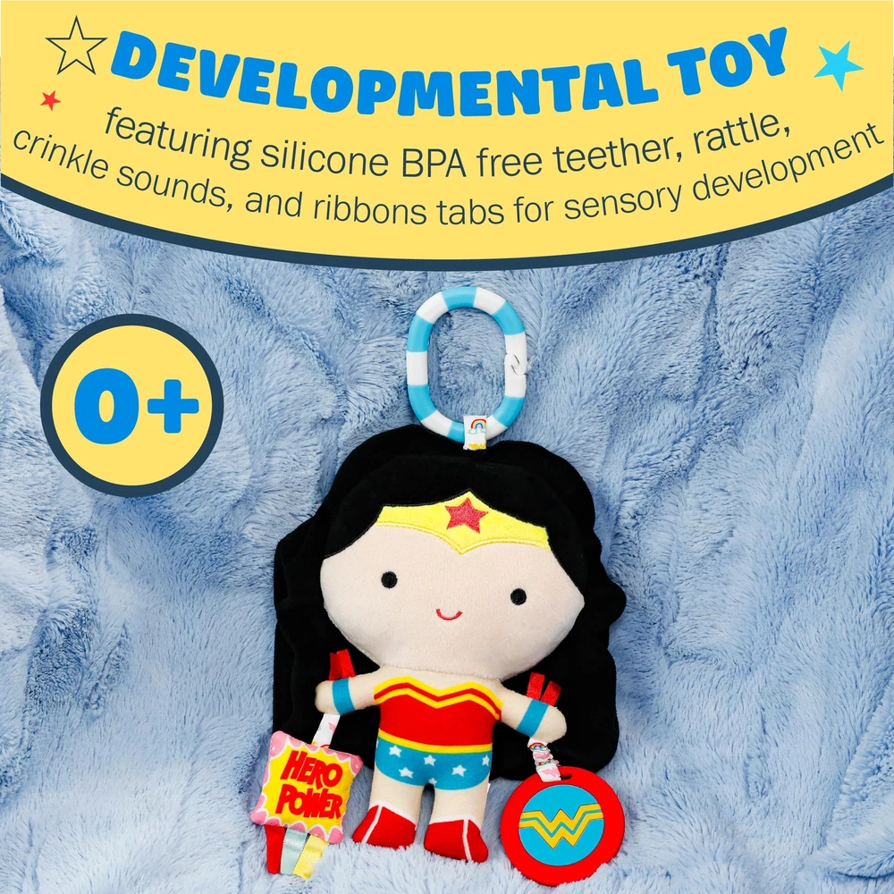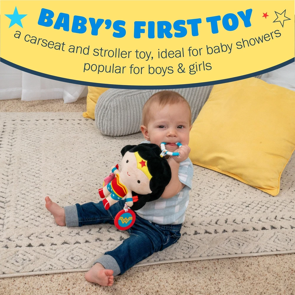 "Wonder Woman™ is the champion of truth and the warrior of peace. As an iconic female pop culture character, Wonder Woman™ has empowered fans for generations and boldly trailblazes a battle for truth through her strength, positivity, and compassion. She fights for those who can’t fight for themselves because she believes in humanity’s potential and its capacity for peace. The Wonder Woman™ Activity Toy measures 11.5 inches including the on the go clip so Wonder Woman can easily go wherever baby wants or needs her most!" Developmental Toy: Help baby learn & grow with an activity toy from DC and Wonder Woman that includes a silicone BPA free teether, rattle, crinkle sounds, and ribbon tabs for sensory development. Soft Teething Toy: Interactive materials keep baby engaged. Soft stuffed plush animal has multiple rings and teethers with fun shapes and textures for chewing and soothing your baby's teeth and gums Baby First Toy: A baby essential, this carseat and stroller toy is ideal for baby showers and new baby welcomes, and is popular for boys & girls ages 0 months to . Lots Of Fun: Ribbons for little fingers, rings to chew, and bright colors keep babies engaged, entertained and soothed. This interactive infant toy delights babies with textures, sounds, & bright colors to discover Modern Classic Baby Toy: Wonder Woman and DC Comics iconic characters are instantly recognizable bringing sweet memories from your own childhood as they help your to learn, play, and grow