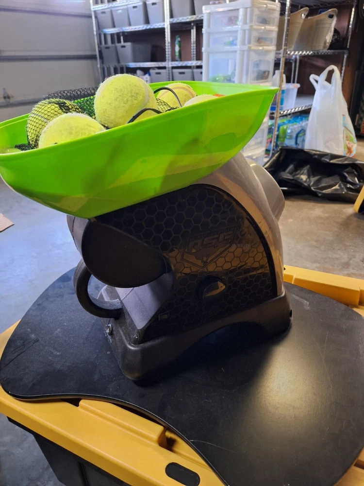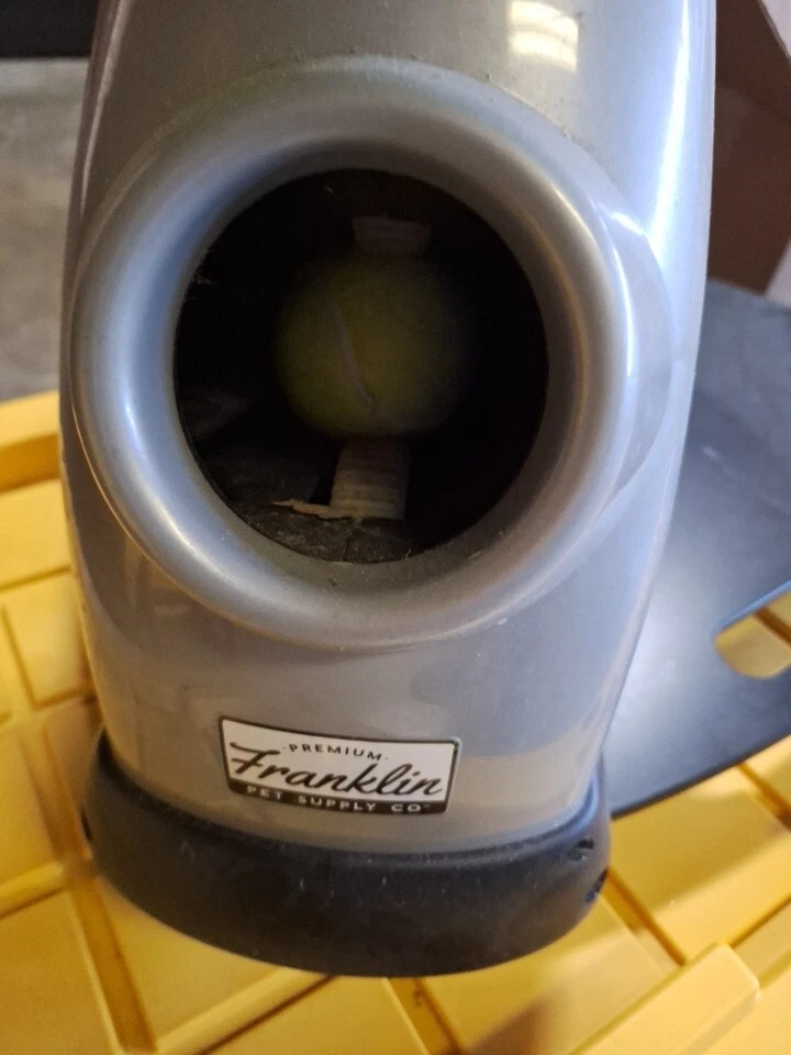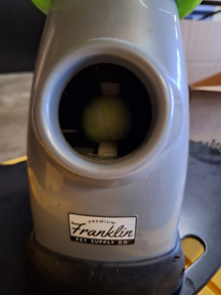 PREMIUM FRANKLIN PET SUPPLY COMPANY DOG BALL TOSS MACHINE WITH CHARGER PREOWNED This item was only used a couple of times, apparantly my dog isnt into fetching :) it includes charger and 9 tennis balls. Great item!