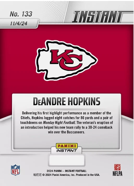 THIS IS A PRESALE FOR THE FOLLOWING UNGRADED BASE CARD: DEANDRE HOPKINS - 2024 PANINI INSTANT NFL #133 - BASE DeAndre Hopkins Kansas City Chiefs PRESALE THIS ITEM IS PRESALE AND IS NOT IN STOCK. WILL SHIP THE DAY AFTER IT ARRIVES FROM PANINI. PANINI WILL SHIP APPROXIMATELY DECEMBER 17TH. WE WILL KEEP YOU UPDATED AS PANINI UPDATES US REGARDING OUR ORDER. ALL PRESALES ARE FINAL. NO CANCELLATIONS OR REFUNDS ON PRESALE ITEMS! THE IMAGE OF THE CARD SHOWN IS FOR ILLUSTRATION PURPOSES AND ISN'T THE ACTUAL CARD YOU WILL RECEIVE. ALL CARDS ARE BRAND NEW AND COME FROM PANINI IN A PENNY SLEEVE AND TOPLOADER. PANINI PUTS TAPE THE TOP OF THE TOP LOADERS. WE DON'T PUT TAPE ON OUR TOP LOADERS. CARDS WILL BE PLACED Up to 6 cards may ship in a personal white envelope (PWE) using eBay's Standard Envelope service for eligible items up to $20 per card and/or a total purchase price of less than $50 for multiple cards. Be sure to check out our other items! If you have any questions, please be sure to ask before ordering! This is BlanFam listing!
