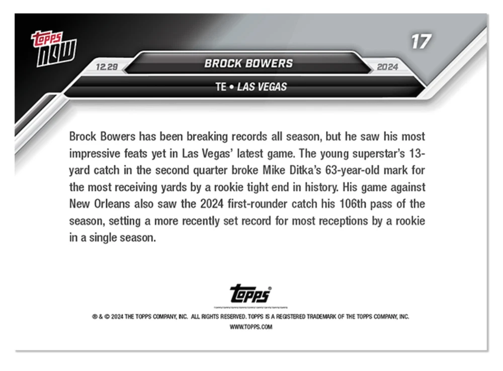This Listing is for the Exact Item Titled PRESALE 2024 Topps Now Brock Bowers RC #17 Rookie TE Receiving Record BASE Card - This listing is ONLY for the BASE version of this card - Cards will ship as soon as they are received from the manufacturer - Message will be sent when manufacturer sends items to keep you informed and up to date