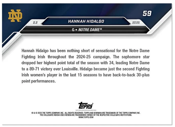 PRESALE 2024-25 Bowman U Now Hannah Hidalgo Back to Back 30+ Point Games #59 Estimated to ship around Early March