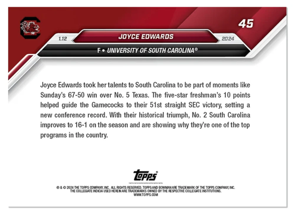 The product is a 2024-25 Bowman U Now sports trading card featuring rookie Joyce Edwards from the South Carolina Gamecocks basketball team. The card, numbered 45, showcases Edwards' SEC season record within the National Collegiate Athletic Association (NCAA). This collectible item is manufactured by Topps. This is a presale. The cards have not yet shipped from Topps. Once they are delivered, I will ship them out the following day.