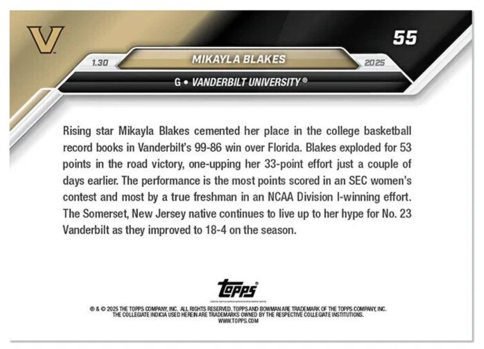 PRESALE 2024-25 Bowman U Now Mikayla Blakes 53 Points in Florida Win #55 PRESALE Estimate to ship around late February.