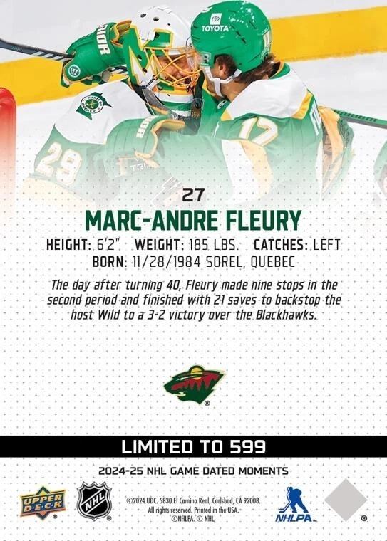 #27 (Nov. 29, 2024) - Marc-Andre Fleury Becomes Second Goaltender in NHL History to Earn a Win as a Teenager and a 40-Year-Old This is a PRESALE PLEASE ALLOW 8-12 weeks for delivery, based on availability from Upper Deck. This listing is for the physical card will be mailed to you. ***Card can be transferred on Epack after being REDEEMED with no shipping cost*** Will combine shipping if interested in others! *** All shipping is $4.50 USD. Canadian/International shipping is done through Ebays International shipping program. I have no control over the associated costs with this.***
