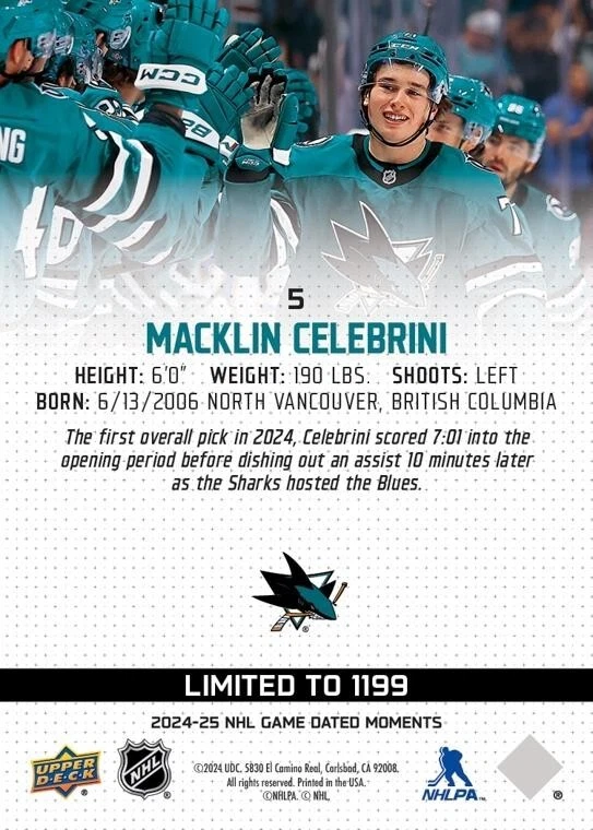 #5 (Oct. 10, 2024) - Macklin Celebrini Has a Goal and an Assist in First Period of NHL Debut with the Sharks This is a PRESALE PLEASE ALLOW 8-12 weeks for delivery, based on availability from Upper Deck. This listing is for the physical card to be mailed to you. ***Card can be transferred on Epack after being REDEEMED with no shipping cost*** Will combine shipping if interested in others! *** All shipping is $4.50 USD. Canadian/International shipping is done through Ebays International shipping program. I have no control over the associated costs with this.***