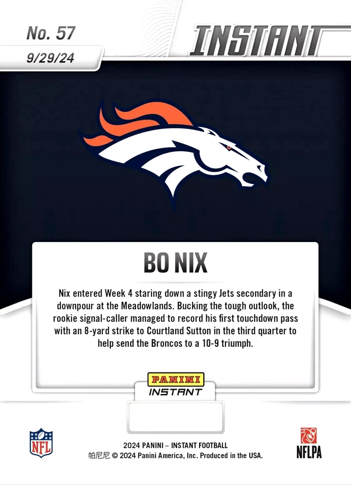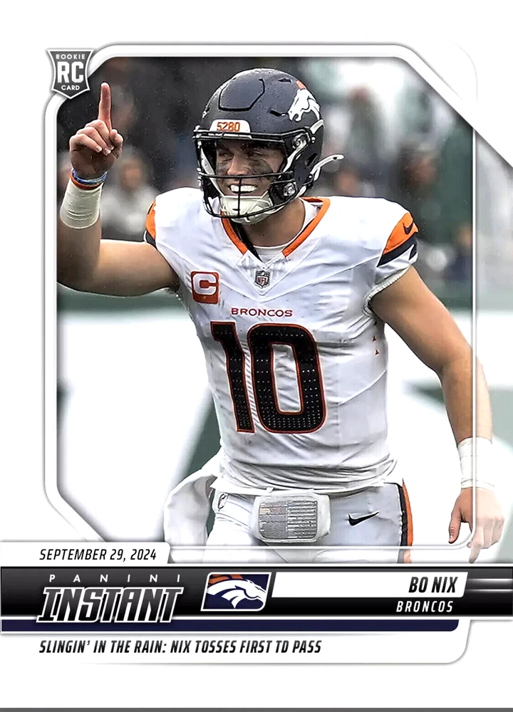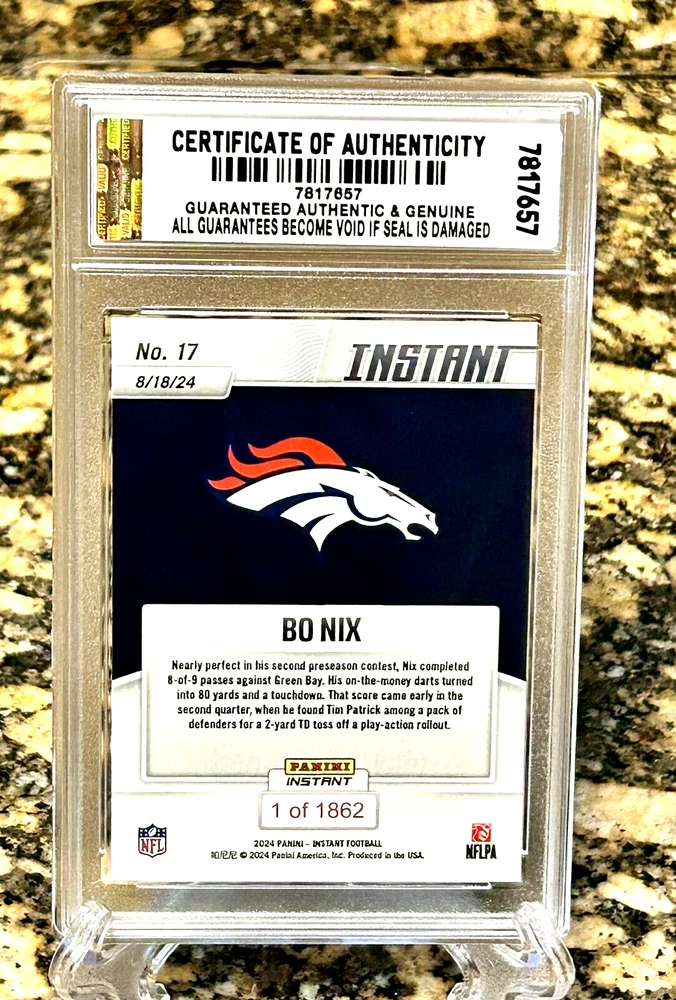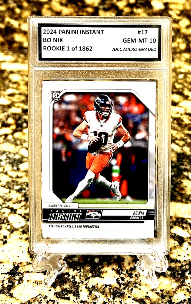 THIS IS A BO NIX #57 PRESALE ORDER SET FOR 40 DAY DELIVERY. Please see the GRADED GEM-MT 10 BO NIX #17 in the listing as an EXAMPLE ONLY to see what your BO NIX card #57 will look like Graded! You will receive JDCC Authorized & Inspected AUTHENTIC MEMORABILIA Micro Graded GEM-MT 10 BO NIX 2024 Panini GRADED GEM-MT 10 Rookie CARD #56! COA! Cards are Professionally inspected, encased and sealed by JDCC - JD’S Coins & Collectibles Inc.! This item is encased in a Crystal Clear Slab with tamper proof #'d hologram sticker and Certificate of Authenticity marked label for extra security and authenticity! The matching SERIAL #’D JDCC COA will accompany this item. Any tampering or removal of the hologram labels will void the JDCC grading authenticity of the item encased. For further protection the case is fitted with a plastic sleeve. It is best to keep the item in the plastic sleeve to protect the slab from any scratches, etc. This is a beautiful product for display and safekeeping! PLEASE FOLLOW OUR STORE FOR NEW INVENTORY & EXCLUSIVE OFFERS! I combine shipping at .50 cents per additional item capped at $9.99. International rates are $14.99. Feel free to send me offers for multiple items and qualify for discount shipping rates and lower costs per item! I send daily invoices every morning so be sure to wait for your combined shipping invoice before checkout or request an invoice when you are ready to pay. fees don't just cover postage but also ebay/paypal fees, supplies, taxes and other costs. 5 Star feedback is Greatly appreciated and FOLLOW our store for New Inventory! Good luck and enjoy!
