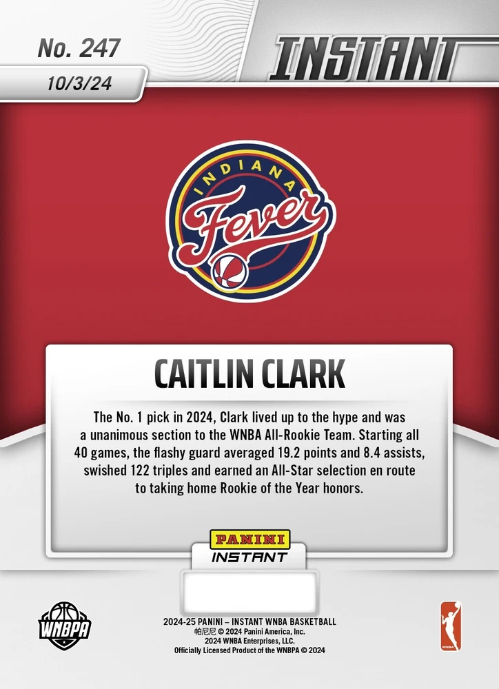 This is a rare and highly sought-after trading card featuring Caitlin Clark, the rising star of the Indiana Fever team in the Women's National Basketball Association (WNBA). The card is from the 2024 set of Panini Instant cards and has the card number 247. It is a sports trading card that showcases Clark as a rookie, making it a valuable addition to any collection. The card is perfect for fans of basketball and the WNBA, and is sure to impress collectors and enthusiasts alike. With its stunning design and high-quality printing, this card is a must-have for anyone who loves sports trading cards. Don't miss your chance to own this unique and valuable card!