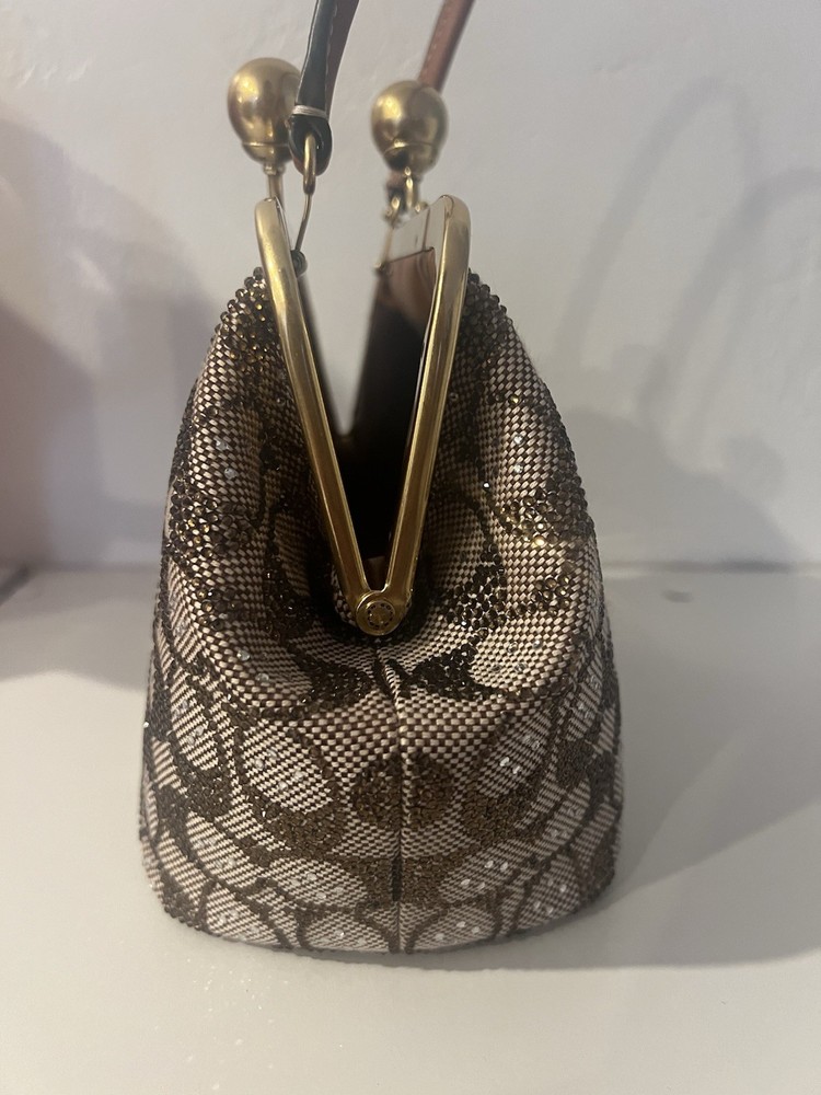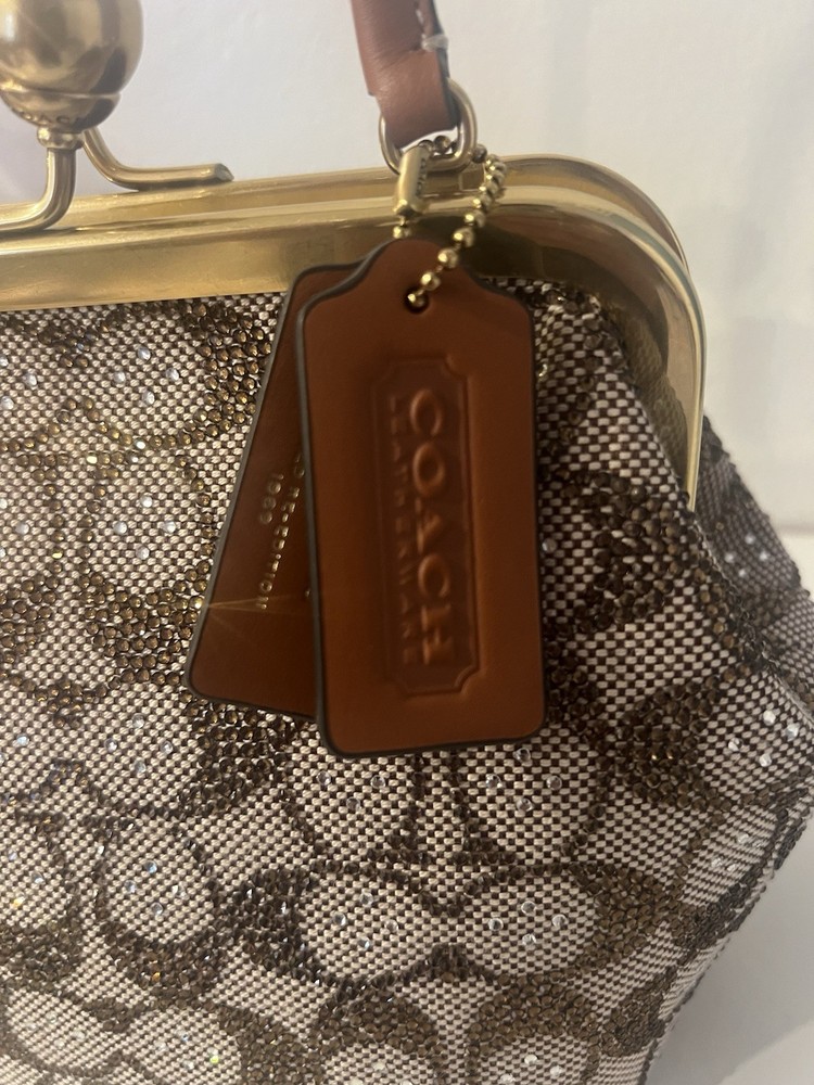This a presale!!! Will ship as soon as next week The Coach Small Crystal Signature Kisslock 16 Bag is a stylish and luxurious handbag perfect for any designer lover. Featuring a kiss lock closure, gold hardware accents, and a brown leather handle strap, this small-sized bag exudes sophistication. The exterior is made of canvas with crystal accents, complementing the brown leather lining. This clutch also comes with detachable straps, a brand card, and a wristlet for added convenience. The Coach Kisslock product line ensures high quality and timeless elegance, making this bag a must-have accessory for any unisex adult looking to elevate their style.