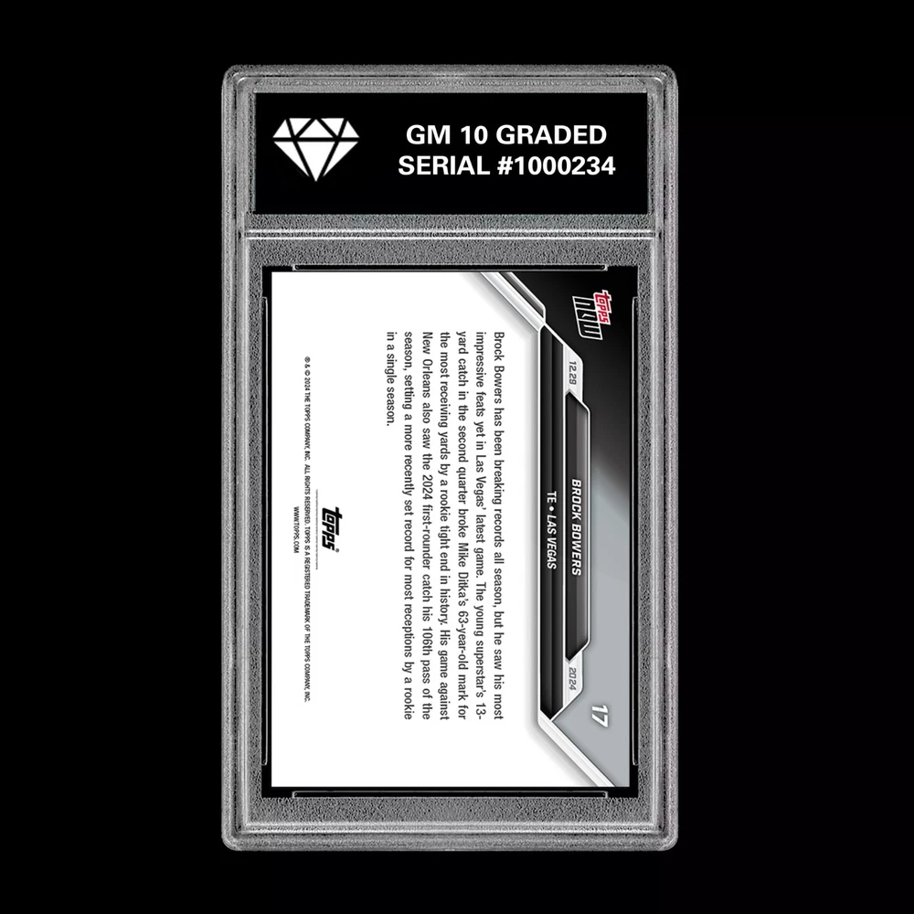 This is a 2024 Topps Now sports trading card featuring Brock Bowers, a rookie tight end for the Las Vegas Raiders. The card commemorates Bowers setting a receiving record during the 2024 season. Graded as a 10, this autograph-free card is a valuable addition to any football card collection. The card number is 17 in the set, manufactured by Topps for the 2024 season. What is a PRESALE? Presale listings are guaranteed to ship within 40 business days of purchase. The date the item will be available is clearly stated in the listing. The listings clearly indicate in the title and description that the item is being offered for presale. Handling time details include the time it will take the me to acquire the item, in addition to the time it will take me to deliver the package to the shipping carrier. Professionally graded by GM10 Grading located in Gettysburg PA, Owned and Operated by Tempus Media LLC, this ensures card authenticity and top-notch quality. These cards are sonically welded and sealed in an acrylic graded card case. Very similar to what the major grading companies use. If you want a big name grading company this isn’t for you. These are not graded by one of the top professional grading companies but a local professional card company. These are 100% authentic cards graded and displayed in a clean professional looking case at discounted price. If you’re not happy with your purchase please let us know and we will send you a prepaid return label. We have sold thousands of similar graded cards and our customers reviews have been awesome. Our collectors love ❤️ our service. You’ll love the clean professional look at the discounted price. If this is a PRESALE those cards will ship ASAP according to eBay Policy.