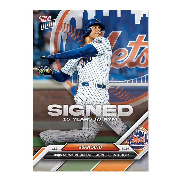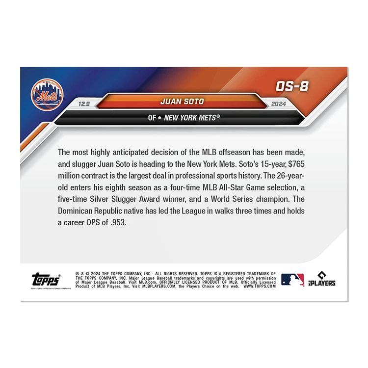 This is a fantastic opportunity to own a 2024 MLB Topps NOW First New York Mets Rookie Card of Juan Soto. The card features the young baseball star in his New York Mets uniform and is perfect for any collector or fan of the sport. It is a Sports Trading Card manufactured by Topps and is not autographed. The card number is OS-8 and it belongs to the Trading Card Singles and Sports Mem, Cards & Fan Shop categories. This item is a must-have for any baseball enthusiast and is a great addition to any collection. Don't miss out on this opportunity to own a piece of baseball history! What is a PRESALE? Presale listings are guaranteed to ship within 40 business days of purchase. The date the item will be available is clearly stated in the listing. The listings clearly indicate in the title and description that the item is being offered for presale. Handling time details include the time it will take the me to acquire the item, in addition to the time it will take me to deliver the package to the shipping carrier.