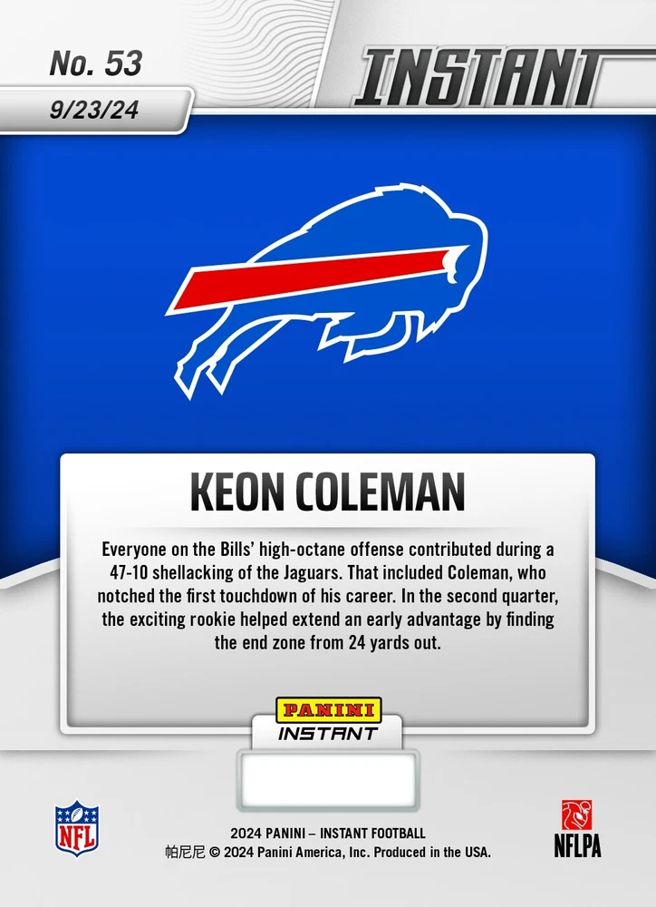 Up for auction is a Keon Coleman #53 RC Rookie Card from the 2024-25 Panini Instant set. This card features the talented quarterback from the Buffalo Bills team and is perfect for avid collectors of sports trading cards. The card is in excellent shape and is a must-have for any fan of the National Football League (NFL). This trading card is a great addition to any collection and is sure to impress. It has been carefully graded and is a top-quality product from the renowned manufacturer Panini. Don't miss out on the chance to own this unique piece of sports memorabilia.