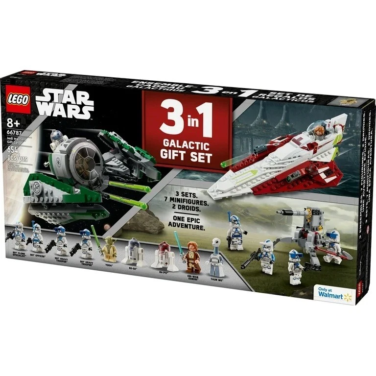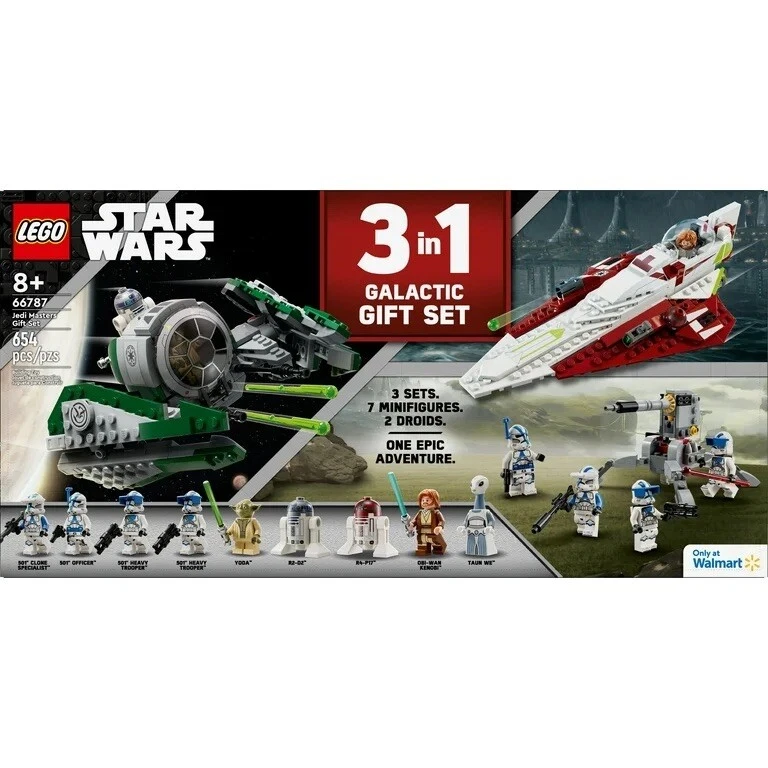 Join forces with legendary Jedi Masters in an epic Starfighter battle. This exclusive Walmart gift pack for builders ages 8 and up features 3 exciting sets: LEGO Star Wars Yoda's Jedi Starfighter 75360, LEGO Star Wars Obi-Wan Kenobi’s Jedi Starfighter 75333, and LEGO Star Wars 501st Clone Troopers Battle Pack, 75345. Swoop and soar in the cockpit of the Delta-7, dodge canon fire and use the Force to defeat the dark side. This special edition Star Wars gift set includes 9 Minifigures including Yoda, Obi-Wan Kenobi, R2-D2, Taun We, and more. Explore a galaxy far, far away with your favorite Star Wars characters! This LEGO Star Wars Jedi Masters Gift Set, makes the perfect holiday gift for Star Wars collectors and little builders. Contains 654 pieces. 3 sets in 1 – Stage epic battles with LEGO Star Wars Obi-Wan Kenobi’s Jedi Starfighter 75333, LEGO Star Wars Yoda’s Jedi Starfighter 75360, and LEGO Star Wars 501st Clone Troopers Battle Pack 75345 building sets Build with the Force – This 3-pack Star Wars gift set includes 2 Starfighters, 2 Jedi Masters, 2 droids, 4 Clone Troopers, 1 Taun We, plus 6 weapons and an AV-7 Anti-Vehicle Cannon Walmart exclusive – This value gift set is only available at Walmart Star Wars toy for ages 8 and up – the LEGO Star Wars Jedi Masters Gift Set is the perfect gift for Star Wars fans ages 8 and up Add to their LEGO Star Wars collection – Includes 9 collectible Star Wars Minifigures to recreate iconic scenes and action-packed adventures Safety is a priority – LEGO components are dropped, heated, crushed, twisted and carefully analyzed to make sure that they comply with stringent global safety standards