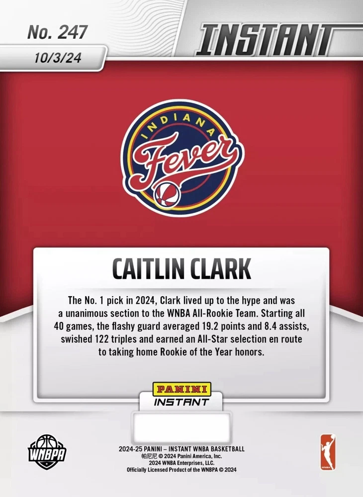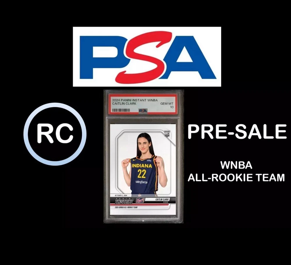 This is a Presale for a PSA 10 GEM MINT of the following Panini Instant base card. CARDS ARE AT PSA BEING GRADED! Caitlin Clark 2024 All Rookie Team (Card #247) Please note that this card is not in hand since it is a presale and can take approximately 60 days for you to receive. Please allow up to 90 days in case of delays. You are purchasing with this understanding and there are no cancellations or refunds. Your card will ship to you the day after it is received from PSA. DON'T SETTLE FOR A GRADED CARD FROM A NO NAME GRADING SERVICE! Beware that many graded cards on eBay are self graded and are not professionally graded and will offer no additional value like a graded card from PSA will. Get a graded card from PSA, the trusted leader in card grading and the brand that demands the highest value and the brand trusted by eBay! THIS LISTING IS FOR THE BASE VERSION OF CARD # 247 IN A PSA 10 GEM MINT. NOT FOR ANY LIMITED EDITIONS OR PARALLELS. IF YOU HAVE ANY QUESTIONS OR ARE UNSURE OR CONFUSED ABOUT THE PROCESS OR ANYTHING AT ALL, PLEASE CONTACT US WITH QUESTIONS PRIOR TO PURCHASING. NO RETURNS ACCEPTED. THIS IS A BLANFAM LISTING! #PANINI-NOW#WNBA#PSA-10#CAITLIN-CLARK#ALL-ROOKIE-TEAM Thank you for viewing this listing! Be sure to check out our other items!