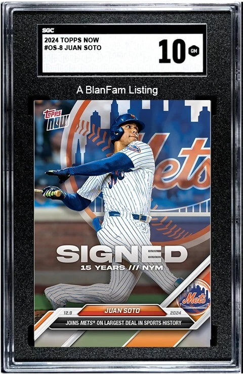 This is a Presale for a SGC 10 Gem Mint of the following card! Be sure to read the "Important Information" section below before ordering. Juan Soto - 2024 MLB Topps NOW Card OS-8 JOINS METS ON LARGEST DEAL IN SPORTS HISTORY This is a PRESALE item. The card will be shipped by Topps to us, then we will submit multiple cards to SGC for grading using their 10 business day service. This should take approximately 30-50 business days (45-75 days). All sales are final. There are no cancellations or refunds on presale items. We purchase our inventory and determine how many cards to send to PSA based on sales. (BEWARE OF LISTINGS FROM OTHER SELLERS FOR GRADED CARDS THAT AREN'T SGC, PSA OR BGS GRADED CARDS! SEE THE BOTTOM OF THIS LISTING FOR ADDITIONAL GRADING COMPANY INFORMATION). IMPORTANT INFORMATION - Make sure you understand and agree to ALL of the following before purchasing: This is a Presale: Cards will be received from Topps in approximately 20-30 business days (30-45 days) and will then be sent to SGC for grading/certification using their 10 Business Day service, which doesn't include processing time and shipping time! By purchasing, you acknowledge and understand that this a presale and the graded cards are not in hand and that it could take 30-50 business days for you to receive your card. You also acknowledge that the card shown is for illustration purposes and is not the actual SGC 10 card you will receive. It is a photoshop illustration showing what it may look like. No Cancellations or Refunds on PRESALE items: All sales are final. We purchase inventory and determine how many cards to send to the grading service based on the number of orders. By purchasing, you understand that cancellations or refunds will not be allowed. Grading Process : Once we receive the cards from Topps, we will send multiple cards to SGC for grading/certification to ensure each order receives a SGC 10 graded card! Their service is currently estimated at 10 business days plus processing and shipping time. Turnaround Time : Please note that the estimated turnaround time is approximately 45 to 75 days (30 to 50 business days) from the order date. This is a presale item, and these cards are not currently in stock for immediate shipment. They must be received from Topps and shipped to SGC for grading. Shipping : Your card will ship the next business day after we receive it back from SGC. You will receive a message from eBay with tracking information once we print your label and prepare your package for shipping. Card will ship in a graded card sleeve, bubble mailer and then placed inside of another bubble mailer to fully protect the graded card. It will ship via USPS Ground Advantage. Pricing: Please be aware that prices fluctuate on presale items and the price could increase or drop significantly before you receive your item. There will be no partial refunds if the going price of this item drops before you receive your item. Make sure you are comfortable with the price before you decide to order. GRADING COMPANY INFORMATION DON'T SETTLE FOR A CARD FROM A NO NAME GRADING SERVICE. MANY ARE SELF-GRADED BY THE SELLER AND AREN'T WORTH ANY MORE THAN THE UNGRADED BASE CARD. IF SOMEONE FROM ANOTHER COUNTRY SUCH AS JAPAN IS SELLING A SGC or PSA GRADED CARD AND THEY SAY THEY HAVE THEM IN HAND WHEN SELLERS IN THE U.S. DON'T, BUYER BEWARE!! ASK QUESTIONS. HOW DID THEY GET THEIR CARDS GRADED SO MUCH FASTER THAN SELLERS IN THE U.S.! SGC TAKES 10 BUSINESS DAYS AND PSA TAKES 20-50 BUSINESS DAYS (30-75 DAYS) TO GRADE BASED ON THE SERVICE SELECTED. THAT DOESN'T INCLUDE THE 30-45 DAYS IT TAKES TO GET THE CARDS FROM TOPPS/PANINI BEFORE THEY CAN BE SENT TO THE GRADING SERVICES. IF IT'S NOT A SGC, PSA OR BGS GRADED, I RECOMMEND YOU STEER CLEAR! THESE 3 ARE INDUSTRY LEADERS IN GRADING AND AUTHENTICATION, TRUSTED BY COLLECTORS AND INVESTORS. If you have any questions about this item, the grading process, the turnaround time or anything else, please message us before purchasing. We appreciate you viewing this listing. Be sure to check out our other items! Thanks for shopping with us! This is a BlanFam listing!