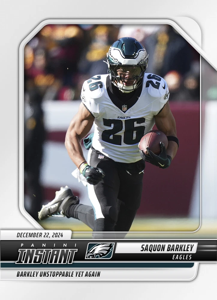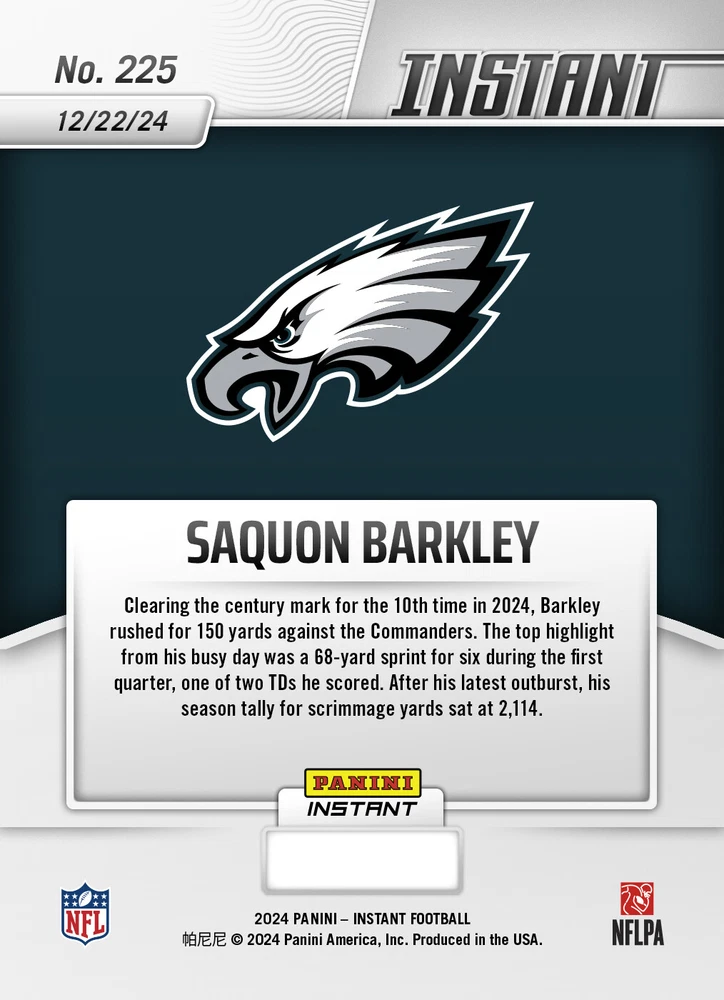 Volume Pricing: When you buy 2 or 3 cards, you will receive a small discount. BUT, if you buy 4 or more cards, we offer a 20% discount! You need to take advantage of this offer! 1 to keep, 1 to store, 1 to look at, 1 to give away! LIMITED TIME OFFERING! IF NO CARDS SELL DURING THIS PRESALE PERIOD, THIS LISTING MAY BE REMOVED. HURRY AND GET YOUR CARD NOW, I WILL RAISE PRICES AFTER EVERY SALE! Please note: This is currently a PRESALE listing. There is an extended wait time for this card to ship as it is still awaiting printing. The Short Description: About this card: Saquon Barkley - 2024 Panini Instant NFL #225 - Base What's special about this card: Clearing the century mark for the 10th time in 2024, Barkley rushed for 150 yards against the Commanders. The top highlight from his busy day was a 68-yard sprint for six during the first quarter, one of two TDs he scored. After his latest outburst, his season tally for scrimmage yards sat at 2,114. If you are someone who wants to collect every single card for a particular person, then this card is definitely for you! Rarity/Quantity Produced: Only (Unknown - still in presale) of this card were created. No more will be made. Availability: PRESALE . We are awaiting inventory from Panini. Card Condition: New/Direct from Manufacturer and shipped to us, then shipped to you. Stock photos shown. Shipping: Via envelope. See below for more details. $1.29 for the first item, $.79 each additional. The maximum shipping charge, no matter how many cards you buy, will be $11.00. The Long Description (please read): Card Packaging and Condition: "Base" Cards: Comes from Panini in a Penny Sleeve and Rigid Top Loader, with tape on top. Potential PSA Grading : While all cards are brand new from Panini, this does not necessarily guarantee a PSA 10 card. It should most often be the case as it is coming packaged directly from the manufacturer. We will not ship cards with obvious major flaws. Our research into PSA graded Panini Instant cards has revealed that approximately: 65% of cards grade PSA 10 30% of cards grade PSA 9 5% of cards grade PSA 8 or lower Our feeling on this is that some people may have broken the Panini seal and improperly handled the card before sending it to PSA, thus reducing the grade received. What is Panini Instant? Panini Instant Cards - Celebrate Iconic Moments with Limited-Edition Collectibles! Panini Instant Cards are exclusive, limited-edition trading cards that commemorate unforgettable moments in sports and entertainment. These cards are released shortly after a memorable event, allowing collectors to own a tangible piece of history. Each card is crafted with premium materials and comes in a variety of stunning designs and rarity levels. Every card is only available in a strictly limited quantity, making them highly desirable for collectors. Here's your chance to own a card that represents a special moment! Available Types of Cards & Rarities: Each Panini Instant Card features unique designs and comes in limited quantities. Here's a breakdown of the types available: Base: Standard design capturing iconic moments; limited to the number of cards ordered within the narrow timeframe they are available for sale . Cards will indicate 1 of #, for example, 1 of 532. The individual number in the series is not displayed. All cards will state "1 of ###" The lower the number, the rarer it is. Parallel Designs - The same photo as the base card, but with design variations referenced below: Blue Viper: Stunning blue-patterned viper design; a truly unique card with only 1 card ever created . Card will indicate "One of One." Versicolor: Unique multi-colored finish; limited to only 5 cards ever created . Card will indicate the individual number in the series, for example, 3/5. White Tiger: Striking white tiger-striped pattern; limited to only 5 cards ever created . Card will indicate the individual number in the series, for example, 3/5. Jaguar: Sleek and fierce spotted design; limited to only 10 cards ever created . Card will indicate the individual number in the series, for example, 3/10. Auto : Autographed, along with one of the options above. For example, a "Jaguar Auto" card would be an Autographed Jaguar design card, limited to 10 cards. Panini directly authenticates and guarantees the autographs. Shipping: "Base" cards ship in an eBay approved standard envelope. Each card will be in a penny sleeve, inside a semi-rigid top loader, taped at the top for security, held in place on a sheet of paper with tape to prevent shifting. Each eBay standard envelope shipment includes a $20 shipping protection plan on a single order, and up to $50 on combined orders to help in case of lost or damaged items. All other cards will ship in a penny sleeve, inside a Rigid top loader, taped at the top for security, held in place on a sheet of paper with tape to prevent shifting, with a sheet of cardboard inserted in the envelope. Ground Advantage rates apply.