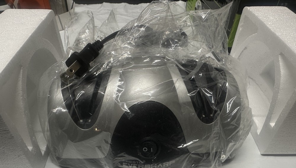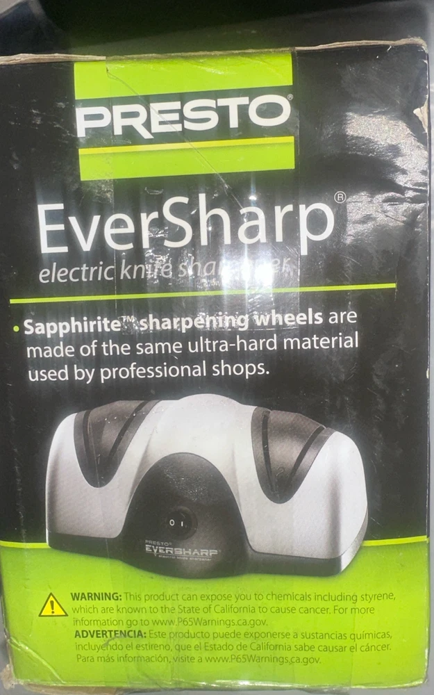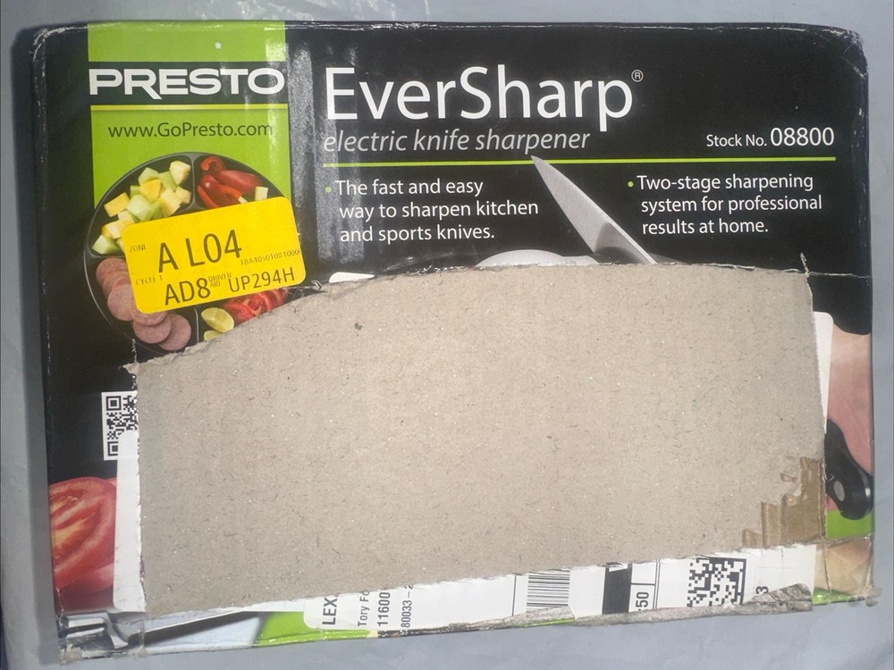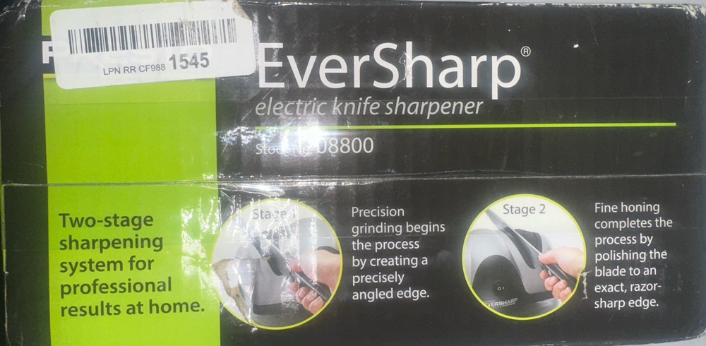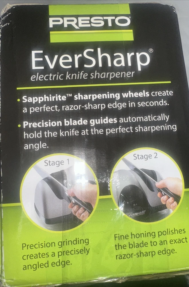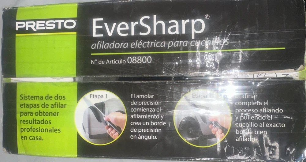 Open box. New condition. Factory packaging is damaged This is a Presto EverSharp Electric Knife Sharpener 08800 with a two-stage system for sharpening your kitchen knives. It is designed with an electric feature to make sharpening easy and efficient. The sharpener is made of plastic and comes in black color. It is a perfect tool to keep your knives always ready to use.