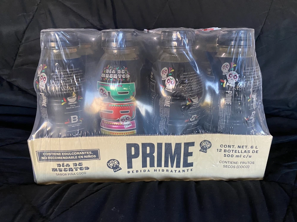 The product is a limited edition Prime bottle featuring a design inspired by the theme of "Dios De Los Muertos." It is a multi-color bottle created in 2024 in Mexico. The design is vibrant and eye-catching, representing the energy drink brand. The product is currently available for shipping. These bottles are extremely hard to get in hand and a confirmed shipment is in-bound now!!! First come first serve while supplies last. Listing is for the sealed case of Prime, there is a small piece of fragile tape in top of the case from Customs Clearance Process. NO RETURNS due to the highly limited availability, images will be sent of the packaging recorded under 4K to prevent EBay claims. **NOW SHIPPING** US SELLER