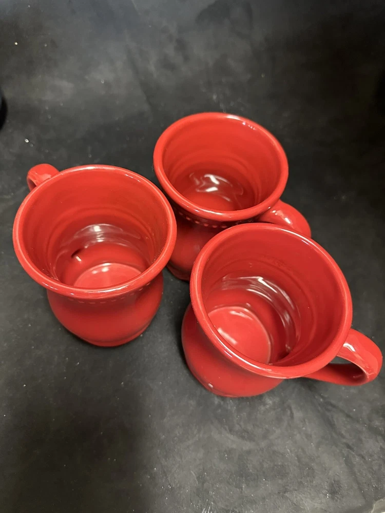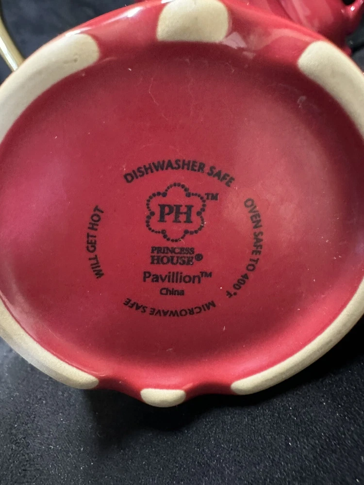 Add a touch of elegance to your mug collection with this set of three Princess House Pavilion Berry mugs. These stoneware mugs feature a round shape with a glossy finish and handles for easy grip. They are perfect for all occasions and come in a set of three. Each mug is oven, microwave, dishwasher, and handmade safe, making them a convenient addition to your dinnerware collection. The set includes four mugs with a printed backstamp and is an original production of the Princess House product line. These mugs are perfect for tea or coffee and are sure to impress your guests. One has a tiny chip on the bottom (see photo).