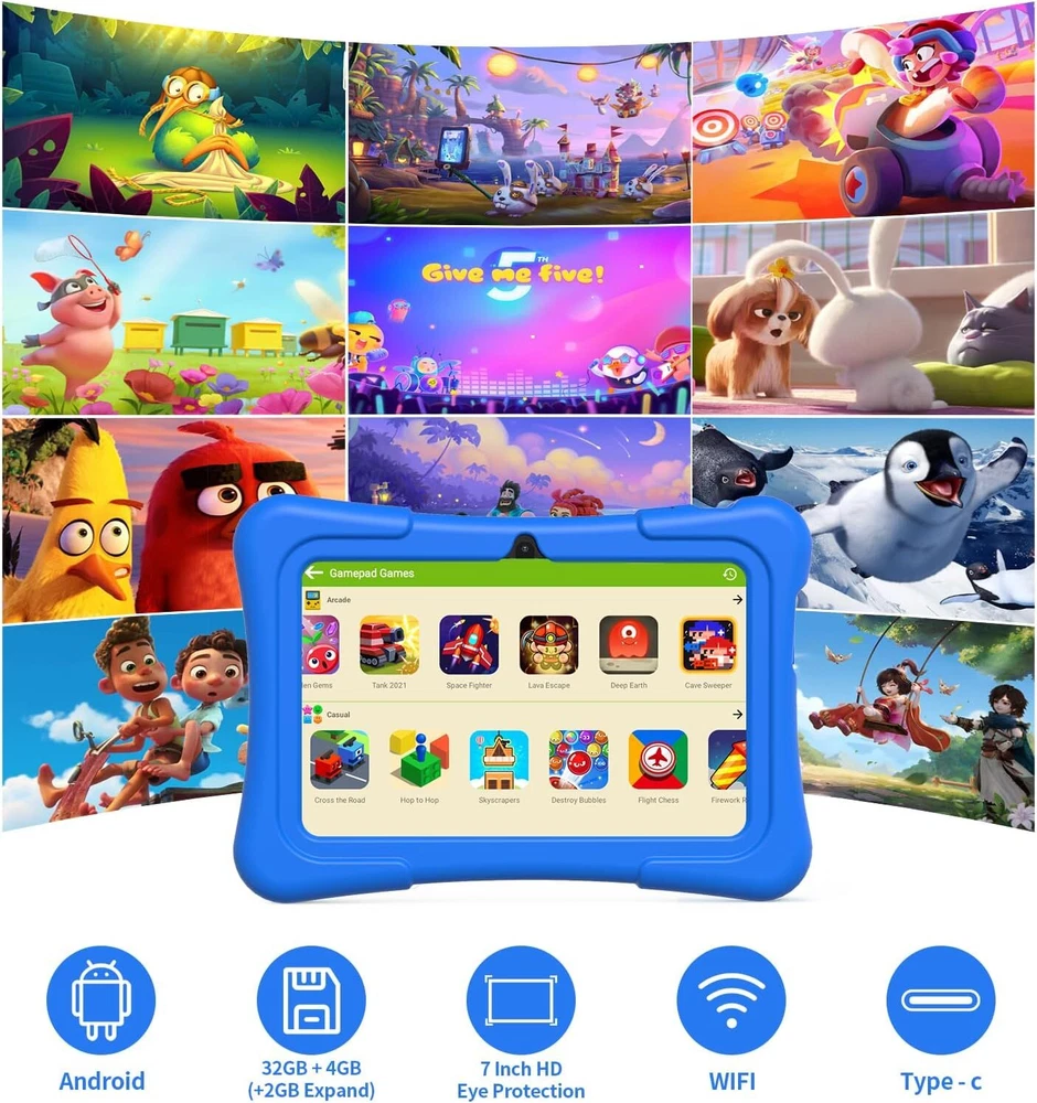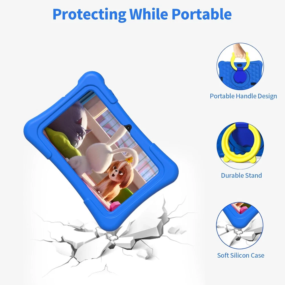 PRITOM Tablet Kids 7 inch, 32GB, Toddler with WiFi, Camera, Blue Product Details Standing screen display size: 7 Inches Max Screen Resolution: 720 Pixels RAM: 2 GB Average Battery Life (in hours): 3.5 Hours Brand: PRITOM Model Name: K7RPO(BE) Screen Size: 7 Inches Display Resolution Maximum: 720 Pixels Operating System: Android ★[FREE KIDS APPS & GAMES] - Pritom Kids Tablet comes with a safe and funny iWawa Kid's software free pre-installed apps for Kids learning & playing, free kids app in the iWawa kids store, you can also download different apps from the Google Play store. An ideal gift for birthday, Christmas, holiday season for kids or yourself. ★ [FANTASTIC EXPERIENCE] - The kids edition tablet has a built-in high-performance quad-core and android 11 System, 1024x600 IPS HD display, WiFi, Bluetooth, cameras, 32GB storage, 4GB RAM(+2GB Expand). You can expand the storage to up to 512 GB for storing photos, music and videos with additional micro SD card extensions. A more stable WiFi module and a durable battery give you a better experience. You will get a powerful all-in-one device. PRITOM Kids Tablet will provide you. ★[BEST KID-FRIENDLY COMPANION] - PRITOM kids tablet is a modern tablet designed for kids to focus on building a safe children's entertainment environment. It has security controls (APPs & Network Filters); Content management (APPs Recommendation & Classification, etc); Behavioral restrictions (Child Locks, Game Time Limits, Preference Data Analysis); Theme & User settings. It's easy to operate enough for kids to watch movies, play games. ★[GREAT TABLET FOR KIDS] - Kids can have their own private playground and the child-friendly Interface makes it easy to use. Kids can access to educational and entertaining apps and websites without any undue risk. Everything in PRITOM TABLET fits for your child's age and skill level. So they always play and learn at the highest level. Effective games & apps are designed to provide innovative digital educational content for ages 3-12, learning animals, learning clothes, learning fruit, typing. ★[WELL-DESIGNED HAND-HELD CASE] - Kid-Proof Case is made of a lightweight, durable, kid-friendly, impact-resistant soft silicone material that protects the tablet from scratches, dirt and bumps, drops, dust, etc. The soft material provides soft and smooth touch experience. The case has stand function, so kids don't need to hold the tablet all the time while learning, watching and playing games. Let the kids fondle admiring. NOTE: The machine should still be anti-drop!