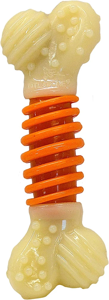 MADE OF DURABLE NYLON - Long lasting dog chew toy challenges even the most aggressive chewers and discourages destructive chewing FUN & OCCUPYING - Multi textured chew toy keeps dogs busy while satisfying their natural urge to chew PROMOTES DOG DENTAL HEALTH - Ridges and nubs help prevent plaque and tartar buildup as dogs chew FOR MEDIUM DOGS - Size Medium chew toy is intended for dogs up to 35 pounds SAVORY BACON FLAVOR - Dog chew toy features an irresistible taste throughout that dogs love CHEW TOY DIMENSIONS: Out of package measures 6" long x 2.5 " wide x 1.25" high TRUSTED CHEW TOYS WITH HEART & PURPOSE - Every chew toy’s unique shape, individual texture, and gotta-have-it flavor is created with purpose and love to give your dog what they need, when they need it! This Nylabone Power Chew Pro Action Dog Chew Toy gives your dog the dental care and chewing satisfaction he needs to stay healthy and happy. This bacon flavored chew toy has durable nylon ends made for powerful chewing and softer ridges in between, making it a dog dental chew toy that helps freshen breath, massage gums, and clean teeth with triple-cleaning action. A dental dog toy and chewing fun all in one! What your dog chews matters! With destructive behavior among the leading reasons dogs are returned to shelters, we know healthy habits can make a life-changing difference. For 70 years, our family-founded brand continues to safely satisfy dogs’ chewing instincts and help them stay in loving forever homes!