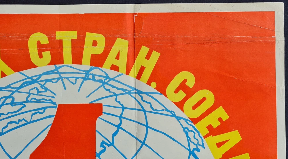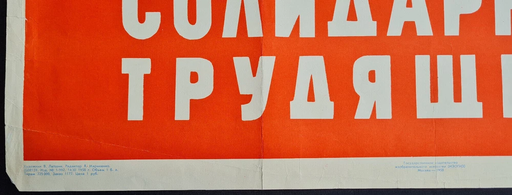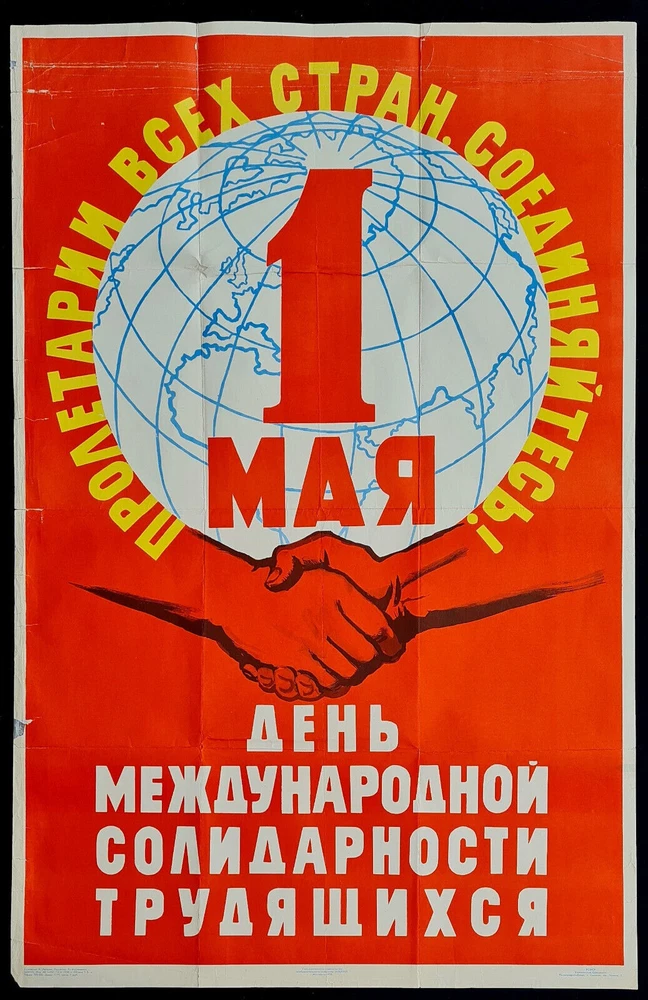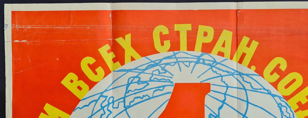 Original slogan on the poster: ПРОЛЕТАРИЙ ВСЕХ СТРАН - СОЕДИНЯЙТЕСЬ! 1 МАЯ - ДЕНЬ МЕЖДУНАРОДНОЙ СОЛИДАРНОСТИ ТРУДЯЩИХСЯ. Literally English translation: PROLETARIAT OF ALL COUNTRIES - GET UNITED! 1ST OF MAY - WORKING INTERNATIONAL SOLIDARITY DAY. POSTER ARTIST: LAPSHYN V. PRINT YEAR: 1958 SUBJECT: HOLIDAY OF 1ST MAY / LABOR DAY LANGUAGE: RUSSIAN PRINT RUN: 225.000 PUBLISHED BY: "IZOGIZ", MOSCOW SIZE: IN: 26 ³/₈ x 40 ½ = CM: 67 x 103 CONDITION: FROM FAIR TO GOOD, CREASES, TEARS Stunning Soviet poster glorifying the 1st of May or Labor Day also known as International Workers' Day - is a May 1st celebration of laborers and the working classes that is promoted by the international labor movement. It became an important official holiday of the Soviet Union, celebrated with elaborate popular parade in the center of the major cities. The biggest celebration was traditionally organized in Red Square, where the General Secretary of the CPSU and other party and government leaders stood atop Lenin's Mausoleum and waved to the crowds. www.facebook.com/sovietartposters Listing and template services provided by inkFrog