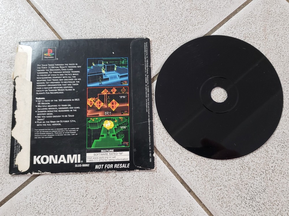 Up for sale is a Playstation 1 PS1 Metal Gear Solid VR Missions DEMO CD Konami. CD has some slight wear from use, but is still in good playing shape. Case / sleeve has some damage / rips from use / age - see pics. Hard to find disc / game! Lowest priced on eBay! Comes from a smoke and pet free home. Please view pictures for more details as they are part of the description. Please ask any questions or requests for pics prior to 24 hours of auction ending to ensure a prompt response. Winning bidder must pay for item within 72 hours after winning. -If the item for sale is a shirt, shoe, clothing item or other item where the pictured/listed size is the manufacturer's label. We are not responsible for actual sizing of item. -Item will be shipped with tracking only! -No insurance will be added - If you wish to add that on after winning auction, please contact us for a revised invoice. -Item will be shipped within 48 business hours after item has been paid for. There are always unforeseen delays in business, so there may be a package or two that could be delayed a couple days. -Please keep track of your purchase! Any item that has been marked as "Returned To Sender" / "RTS", "Undeliverable" or "Unknown Address" / "Insufficient Address" is the buyers fault. If an item meets these conditions and there is no response from the buyer within 30 days of returned date, buyer forfeits transaction, costs and fees. -Any item that is determined misrepresented and not as described can be returned - BUYER AGREES TO PAY FOR RETURN SHIPPING. Item must be returned and postmarked within 14 days of receipt. -Items with "as pictured" or "as is" in description will be sold on grounds "what you see is what you get". In many of these cases, I don't have a way of testing the item and the buyer must understand that the item may or may not need repair. -Winning bidder / buyer agrees to these terms and conditions. -Shipping prices have risen as of July 9, 2023. WE ONLY SHIP TO 48 CONTINENTAL STATES!!! Please bid with confidence! No Reserve! Happy Bidding! Please DO NOT message us on a "Buy It Now" listing if we will take a lower asking price. The listing is a "Buy It Now" and not a "Best Offer" listing. Any messages regarding a person trying to haggle a price will be ignored. If you are interested in the item and think it's priced too high, please "watch" the item, as we will drop prices every so often if the listing does not sell. PLEASE DON'T LEAVE NEGATIVE OR NEUTRAL FEEDBACK! WE STRIVE TO KEEP OUR BUYERS HAPPY! IF THERE IS AN ISSUE WITH YOUR PURCHASE, PLEASE CONTACT US BEFORE LEAVING NEGATIVE OR NEUTRAL FEEDBACK! POSITIVE FEEDBACK IS ALWAYS APPRECIATED!