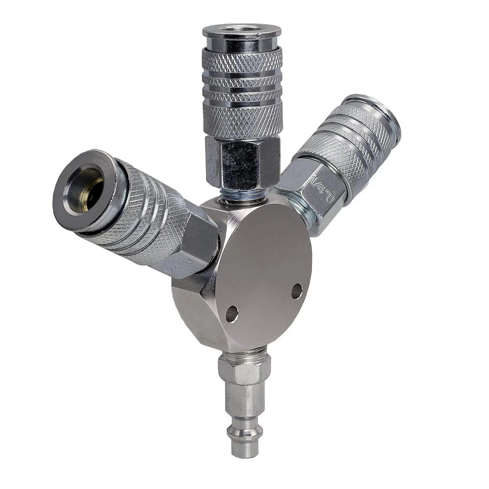 The PS3WAM 3-Way Steel 1/4" Air Manifold with Universal Quick Connect Couplers significantly increases the productivity of DIYers at home as well as professional contractors at the job site. This must-have accessory splits 1 air line into 3 lines to efficiently power multiple tools at the same time. Featuring durable steel construction with a lightweight aluminum alloy flat hex block, this 3-way air manifold is built to last. The inlet connects to 1/4" industrial couplers, and the 3 outlets connect to 1/4" industrial, automotive, and ARO plugs. The universal quick connect couplers are specifically designed to make connecting and disconnecting a snap, and have sleeve guards to reduce accidental disconnects along with preventing damage to the coupler. The 3-Way Steel 1/4" Air Manifold with Universal Quick Connect Couplers will allow you to complete projects in record time, saving you time and money. Split 1 air line into 3 lines to efficiently power multiple tools at the same time Durable steel construction with a lightweight flat hex aluminum alloy block Inlet connects to 1/4" industrial couplers Outlets connect to 1/4" industrial, automotive, and ARO plugs Universal quick connect couplers make it fast and easy to connect and disconnect Sleeve guards on the couplers reduce accidental disconnects and prevent damage to the coupler