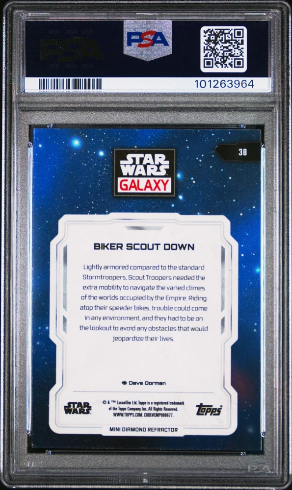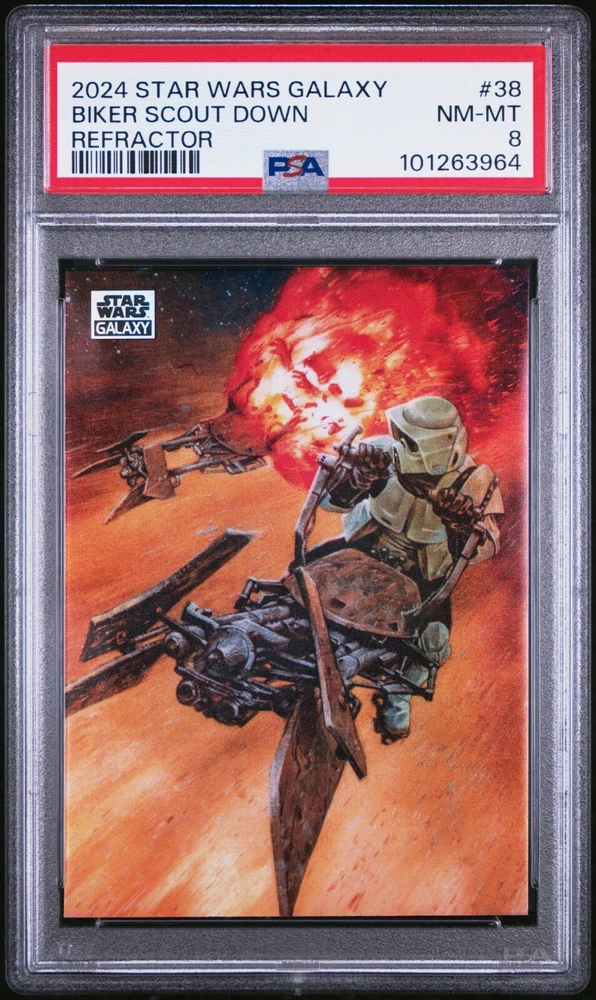 (PSA 8) 2024 Star Wars Galaxy #38, “Biker Scout Down” Refractor