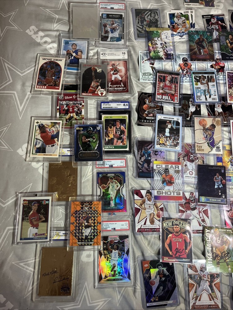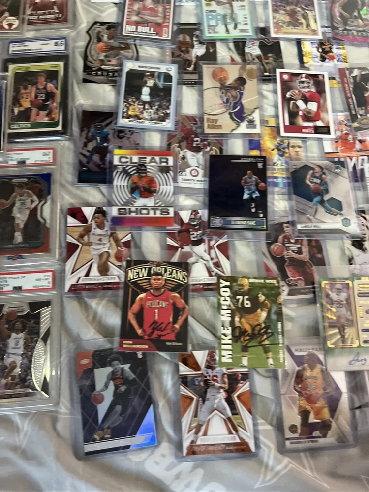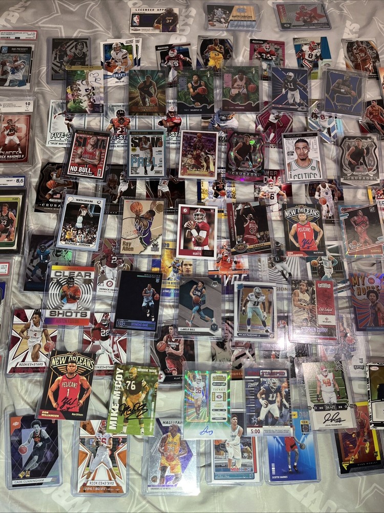 This is a sports trading card lot featuring three autographed rookie patch cards from the 2021 season of the National Football League (NFL) and other sports leagues. The cards are autographed by players such as Cj Stroud, Allen Iverson, Aaron Jones, and A.J. Brown. Each card is framed and serial numbered, with hologram authentication from Panini Authentic. The lot includes a mix of rookie, parallel, 1st edition, insert, and chase cards from various teams like the Cincinnati Bengals, Green Bay Packers, Chicago Bulls, and more. These limited edition cards are in pristine condition, making them a valuable addition to any collector's collection.