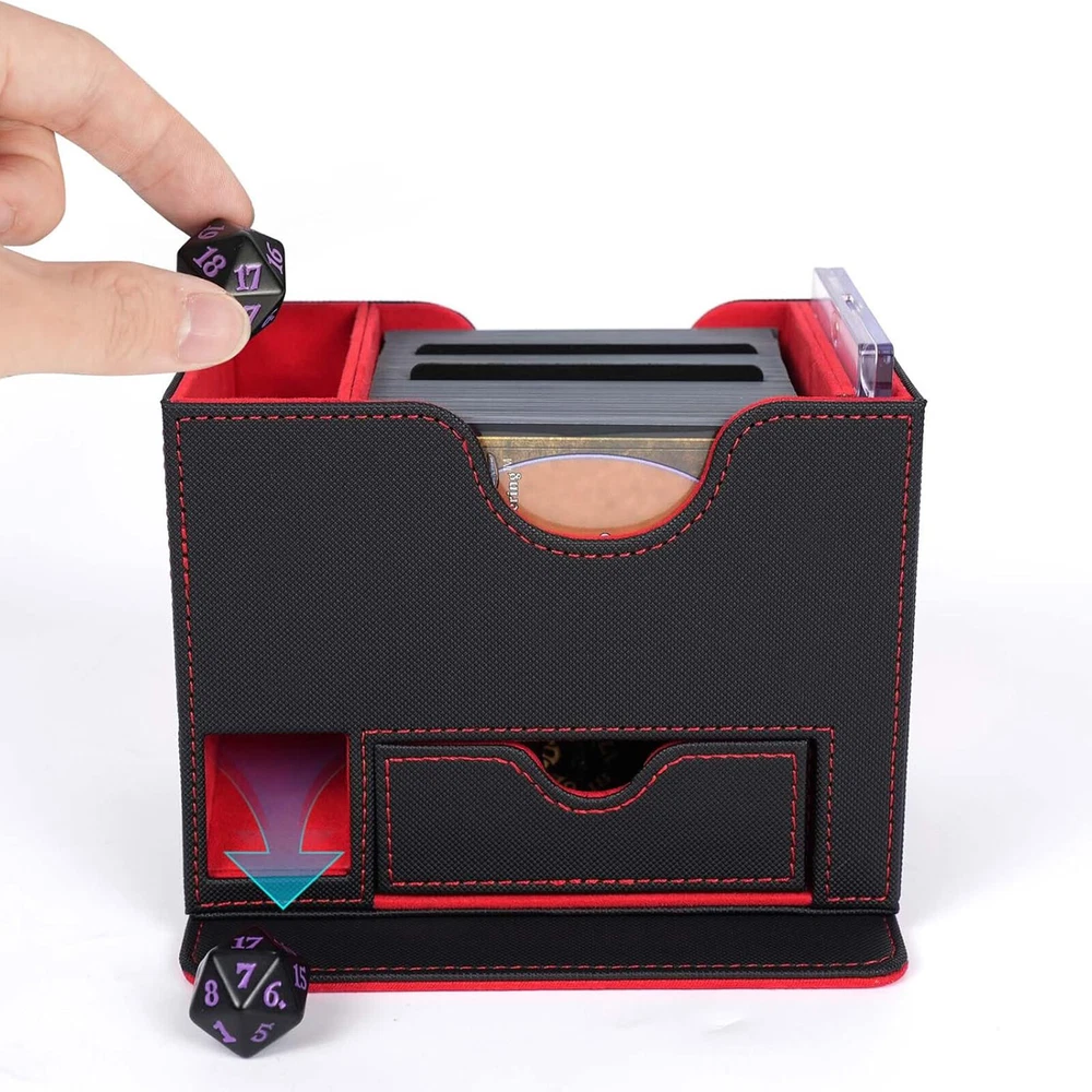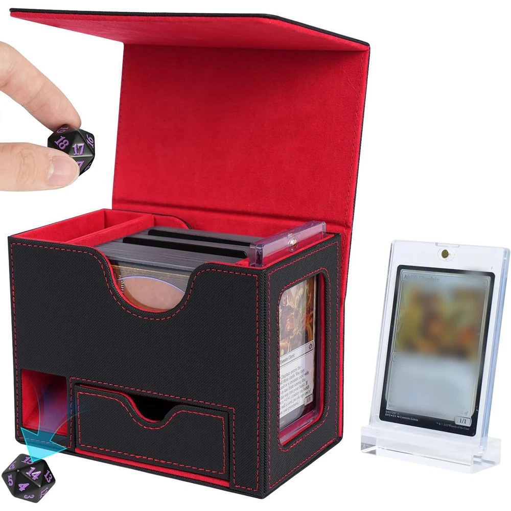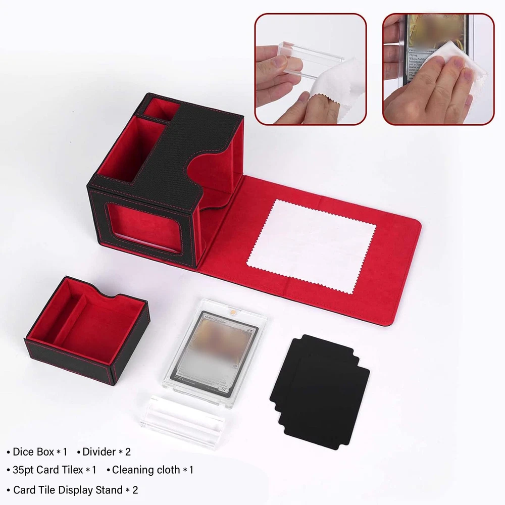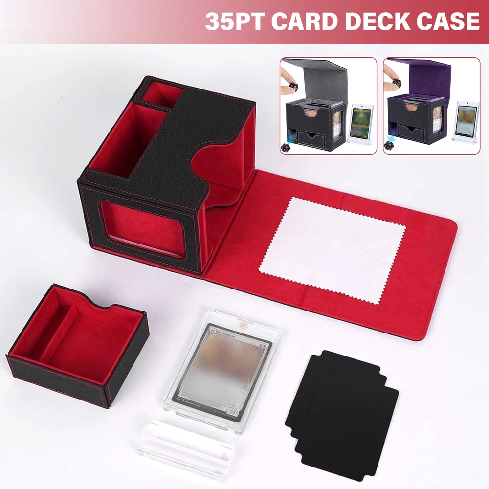Product Description PU Card Deck Case Trading Card Storage Box W/1PC 35PT Card Protect Holder& Stand Features: -Spacious Storage Capacity: This MTG deck box features one compartment with window and a dice compartment, capable of holding up to 120 single-sleeved cards or 100+ double-sleeved cards, offering ample space for your entire collection. -Universal Compatibility: With its strong magnetic clasp and versatile design, this deck box is suitable for storing all TCG/CCG or collectible card games, including but not limited to Magic: The Gathering, Pokemon, YuGiOh!, Star Wars X-Wing, Game of Thrones, World of Warcraft, Force of Will, Five Rings, Cardfight!! Vanguard, Duel Masters, Panini Soccer, Baseball, Basketball cards, and more. It's the ideal gift for any card game enthusiast, specifically designed for Commander EDH players. -Classic Black Leather Exterior: Combining timeless elegance with durability, the black leather exterior paired with a dynamic suede interior creates a stylish and protective deck box. The exterior leather is waterproof and easy to clean, ensuring hassle-free maintenance and long-lasting use. -Strong Magnetic Closure: The secure magnetic clasp ensures a snug fit, offering perfect protection for your trading cards during storage and transportation. -Gift-Ready and Stylish: With its exquisite craftsmanship and sleek design, this deck box makes an ideal gift for any card game enthusiast. Specification : Material ; PU leather Color : Red,Puple,Gray Outer size : 15.5*10.1*12.2cm Package included: 1 x Deck box 1 x 35pt card protect holder& stand 2 x Black divider OR 1 x 35pt card protect holder& stand