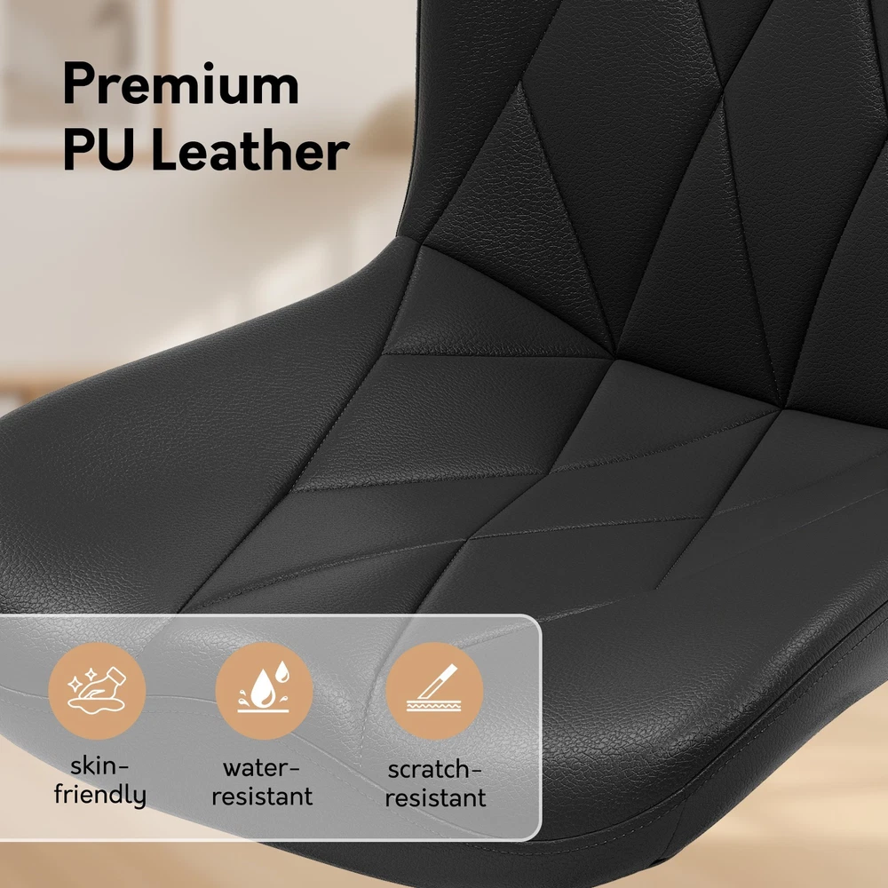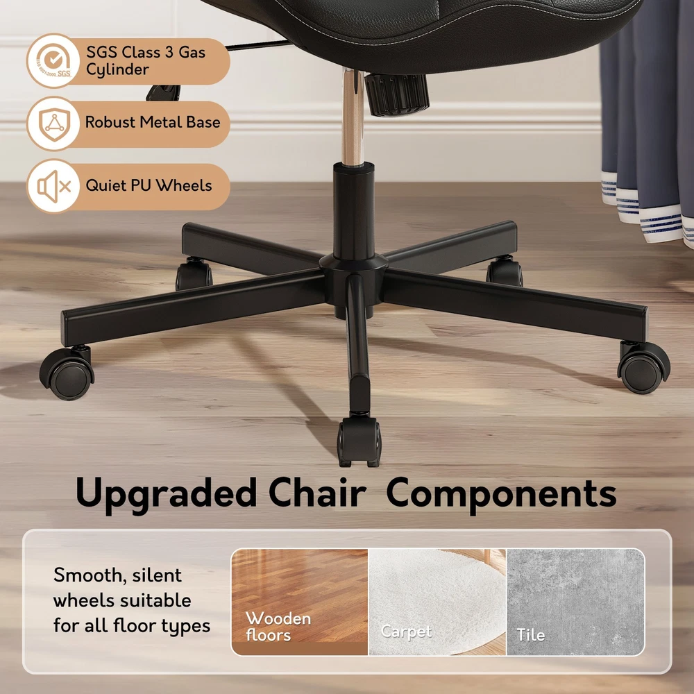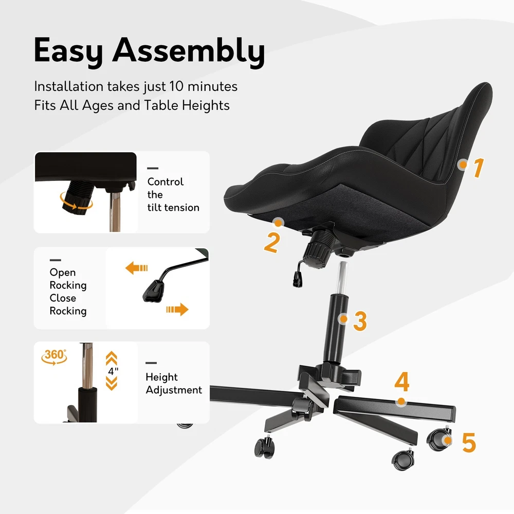 Features: Ergonomic M-Shape Design — Contoured backrest provides lumbar, coccyx, and leg support to maintain healthy posture during long hours. High-Density Foam Cushion — 3.5" thick padded seat with resilient foam ensures 8+ hours of pressure-free comfort. Adjustable Height & Tilt — Seat height adjusts from 17" to 21" and tilts from 90° to 110° with tension control knob. Smooth Mobility — 360° swivel base with five durable caster wheels allows easy movement on any surface. Stylish PU Leather — Sleek white PU leather is waterproof, easy to clean, and adds a modern touch to your workspace Product Details: Overall Dimensions: 23"D × 17.7"W × 28.7"-32.6"H Seat Size: 18.9"W × 17"D × 3.5" thick Seat Height: 17"-21" adjustable Back Height: 15.7" Weight Capacity: 300 lbs Material: PU leather, High-density foam, Metal base On Sep 11, 2025 at 23:52:05 PDT, seller added the following information: