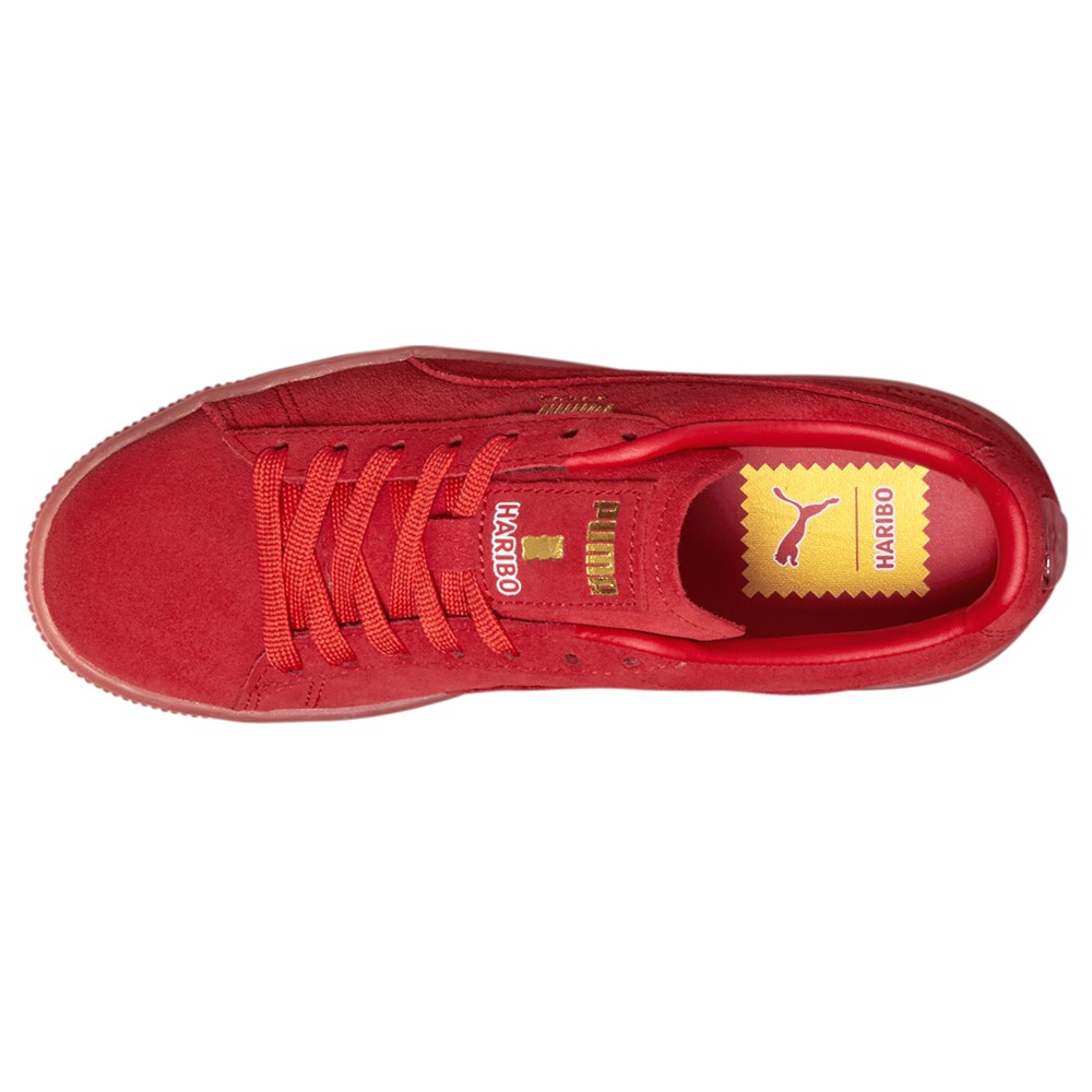 Suede Lace Up Sneakers (Big Kid) Product Details Full Suede Upper Haribo gummy bear hangtag attached on the laces Haribo gummy bear graphic on the FOT Deboss and printed branding on the tongue Color: Poppy Red/Poppy Red The PUMA Cat and the HARIBO Goldbear finally meet in this all-new collaboration. For over 100 years, HARIBO has been celebrated worldwide for their delicious fruit gummies and licorice – and PUMA x HARIBO continues that tasty tradition. Collection pieces are playful and candy-colored, with authentic cobranding and streetwise design details. Additional Details Manufacturer Color: Poppy Red/Poppy Red Color: Red Occasion: Casual Gender: Boys Age: Youth Brand: Puma