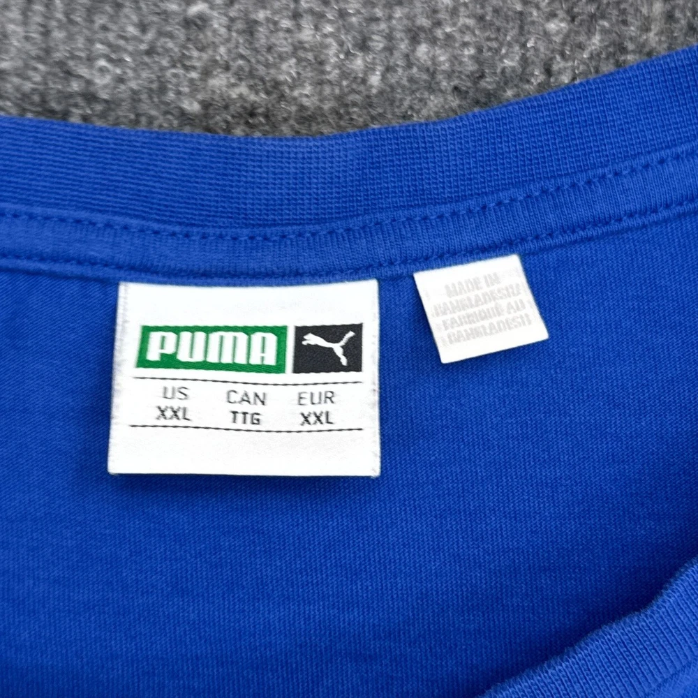 Pattern: Solid Size Type: Regular Color: Blue Type: T-Shirt Neckline: Crew Neck Garment Care: Machine Washable Features: Double-Sided Vintage: No Personalize: No Sleeve Length: Short Sleeve Fit: Regular Size: 2XL Theme: Sports Department: Unisex Adults Accents: Logo Material: Cotton Fabric Type: Knit Brand: PUMA Handmade: No