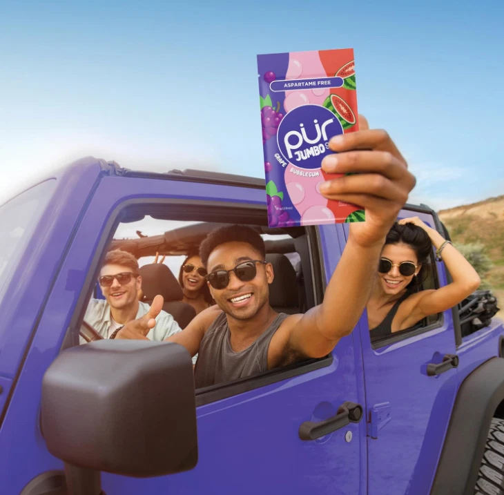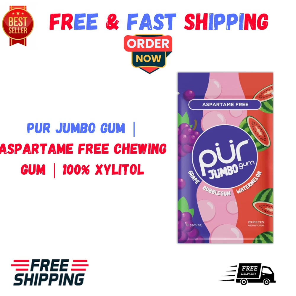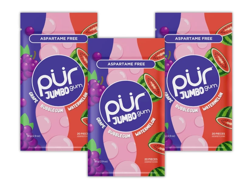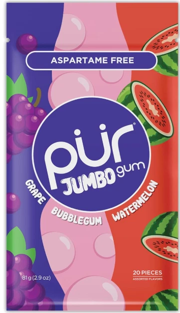 PUR Jumbo Gum | Aspartame Free Chewing Gum | 100% Xylitol | Natural Bubblegum, Grape, Watermelon Flavor, 20 Pieces About this item · NATURALLY DELICIOUS BIG FRUITY FLAVOR: Your favorite childhood gum, but better! Mouth watering natural bubblegum, grape, and watermelon flavors that are sure to be an easy addiction. Comes in a resealable bag. · 3X BIGGER: Experience the satisfying chew with our larger piece gum! Each generously sized piece offers an unparalleled chewing experience, allowing you to savor the taste. Elevate your gum experience with JUMBO's larger pieces - more flavor, more satisfaction! · KICK ASPARTAME: Aspartame free & Sugar free gum that is naturally sweetened with 100% xylitol. Xylitol is an all-natural sugar alcohol that looks and tastes just like sugar, yet has 40% fewer calories. · ALLERGEN FREE GUM: PUR Gum is made just for you. We are Vegan, Aspartame Free, Non-GMO, Sugar Free, Gluten Free, Soy Free, Nut & Peanut Free, Keto Friendly, and Swiss Made. · OUR MISSION: PUR creates products with the highest quality ingredients to help you make simple substitutions so that your everyday decisions to live a healthier lifestyle are effortless. Product Description: JUMBO : This sugar free gum has a fruity bubblegum, grape, and watermelon flavors. Each piece of Jumbo gum is 3x the size of a regular chiclet! Each resealable bag of Jumbo gum contains 20 pieces. Our Story : Founded in 2010, PUR was built on the founding principle of making simple substitutions to promote a healthier lifestyle, without compromising taste or quality! With a growing number of dietary restrictions and health-conscious consumers, PUR set out to create products that everyone could safely consume, enjoy, and share! Naturally Sweetened with 100% Xylitol : PUR uses sustainably sourced xylitol. It looks & tastes just like sugar with 40% less calories than sugar while boosting oral health. Try PUR : Taste our New PUR Popcorn, New PUR Mints, PUR Gum & PUR Blister Gum!