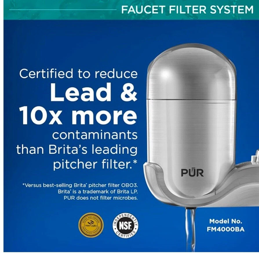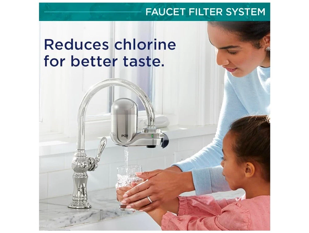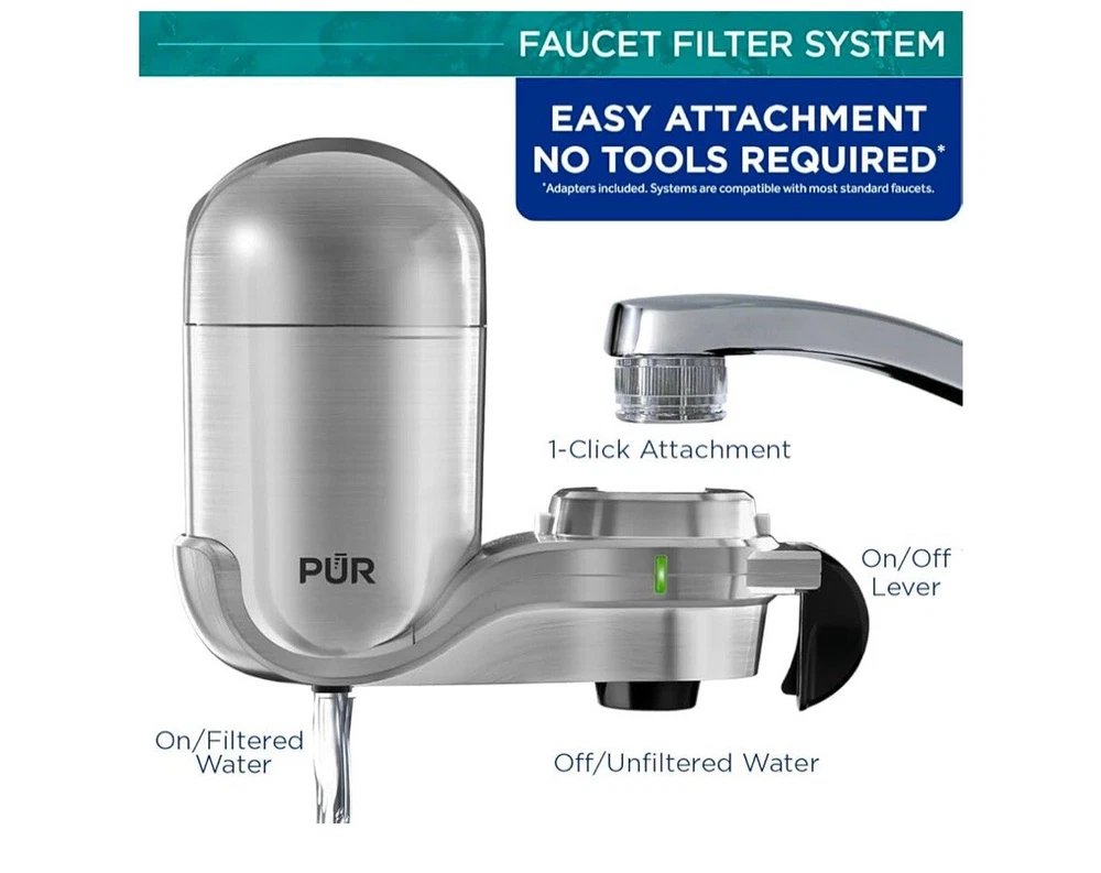 PUR PLUS Vertical Faucet Mount Water Filtration System with 3-in-1 Lead Reducing Filter for Great-Tasting Filtered Tap Water, Lasts 100 Gallons, Fits Most Kitchen or Bathroom Faucets, Stainless Steel