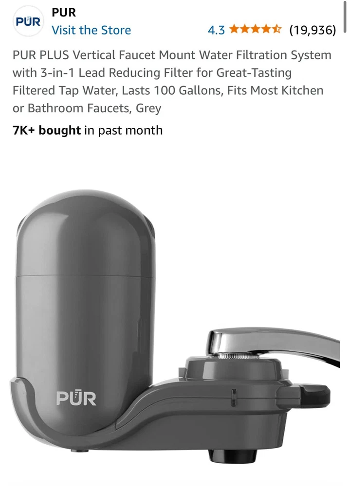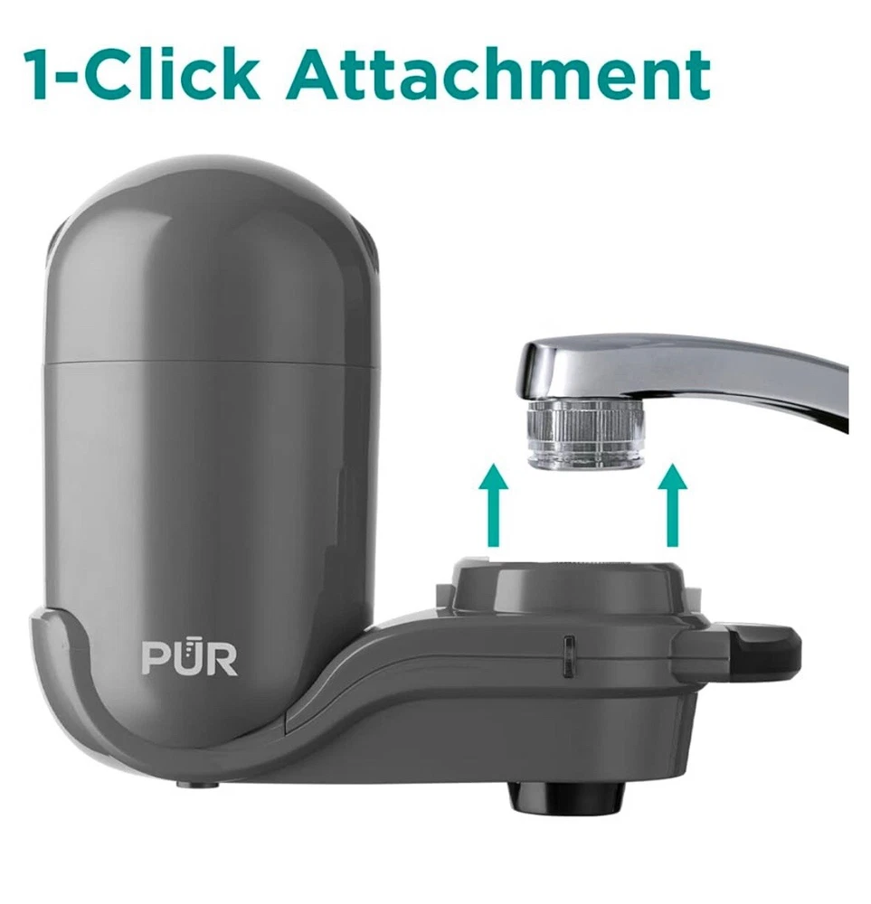 PUR PLUS Vertical Faucet Mount Water Filtration System with 3-in-1 Lead Reducing Filter for Great-Tasting Filtered Tap Water, Lasts 100 Gallons, Fits Most Kitchen or Bathroom Faucets, Grey