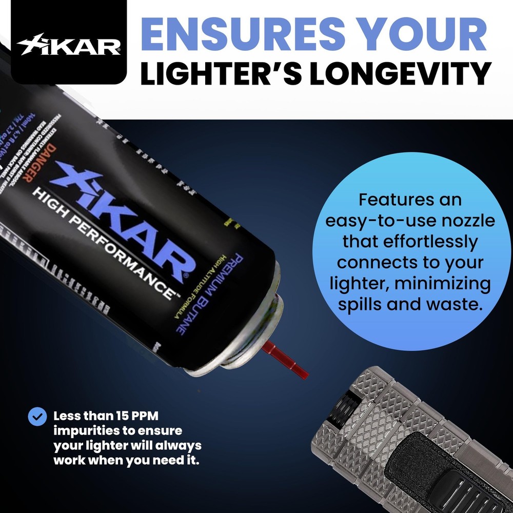 Experience the pinnacle of lighter fuel performance with PUROFINE High Performance Butane. Engineered with a high-altitude formula, this premium butane is meticulously crafted to ensure reliable ignition and a strong, steady flame, even in the most challenging conditions. Whether you're embarking on outdoor adventures at high elevations or contending with adverse weather, our butane rises to the occasion, delivering unmatched performance every time you light up. One of the key features of PUROFINE High Performance Butane is its near-zero impurities, which are meticulously filtered out during the production process. This meticulous purification process helps to prevent misfires and clogs in your lighter's fuel line, significantly extending its lifespan and ensuring consistent performance over time. Say goodbye to frustrating malfunctions and hello to hassle-free lighting experiences, thanks to our high-performance formula. But PUROFINE High Performance Butane isn't just for high altitude users – it's the perfect choice for all lighter owners who demand superior quality and reliability. If you've been experiencing issues like flickering flames or low flame height, our high-performance formula can effectively clean and unclog your lighter's gas line and burners, restoring it to optimal condition with ease. When you choose PUROFINE High Performance Butane, you're choosing the assurance of excellence from a trusted name in lighter fuel. Elevate your lighting experience and enjoy the peace of mind that comes with using the best – choose PUROFINE High Performance Butane for your next refill. SUPERIOR PERFORMANCE: Our high-performance butane is expertly formulated to deliver superior performance, ensuring a steady and reliable flame every time. This formula ignites a more robust and powerful flame, enhancing your lighting experience. INCREASED PERFORMANCE AT HIGH ALTITUDES: Designed to provide increased performance at high altitudes, purofine eliminates flickering flames and inconsistent ignitions often experienced in elevated regions. PREVENT MISFIRES AND CLOGS IN FUEL LINE: PUROFINE can extend the life of your lighter by keeping the fuel line clean and preventing frustrating malfunctions. Simply refill your lighter with our premium butane, and experience the difference as it clears away debris and ensures smooth, reliable ignition every time. UNIVERSALLY COMPATIBLE: Compatible with all lighters, purofine offers effortless refills and optimal performance across every model, whether it's a single flame or a triple torch. NEAR ZERO IMPURITIES: With less than 15 parts per million impurities, this butane refill is super clean, ensuring your lighter works flawlessly every time you refill it without any problems caused by dirt or gunk buildup.